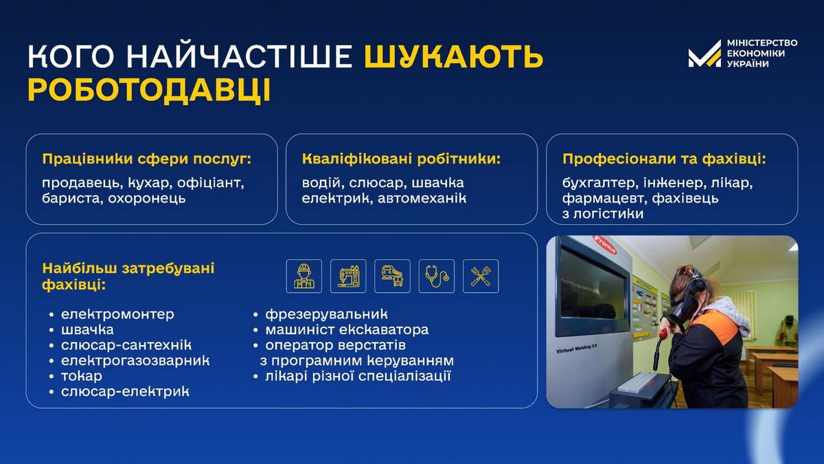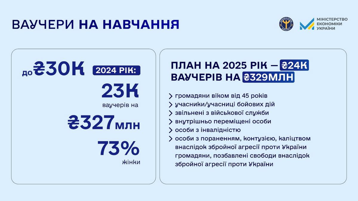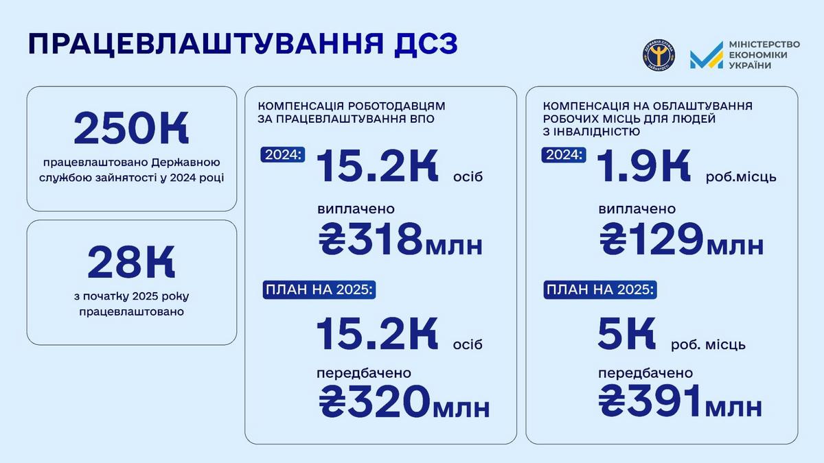 Так само є програми від Державної служби зайнятості. Зокрема, програми компенсації за працевлаштування внутрішньо переміщених осіб. Роботодавцю компенсується зарплатня такої особи за три місяці роботи в розмірі мінімальної зарплати. Але якщо це особа з інвалідністю – за шість місяців. Це також може допомогти бізнесу. Бізнес і держава мають максимально взаємодіяти, аби активізувати працевлаштування людей. В Мінекономіки підрахували: скільки українців отримали нову кваліфікацію (перекваліфікувалися) за різноманітними програмами – як від бізнесу так і за допомоги міжнародних партнерів, а також за участі Мінекономіки. У 2024 році професійне навчання пройшли понад 100 000 осіб. Цього року в планах уряду перенавчити не меншу кількість українців.