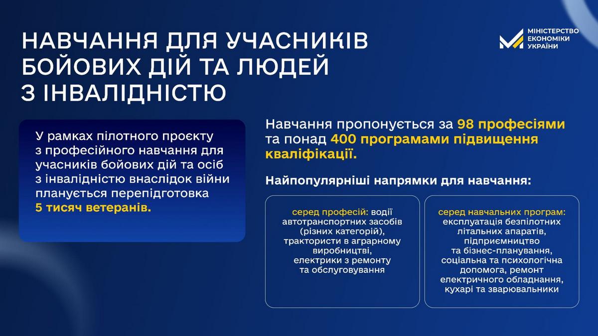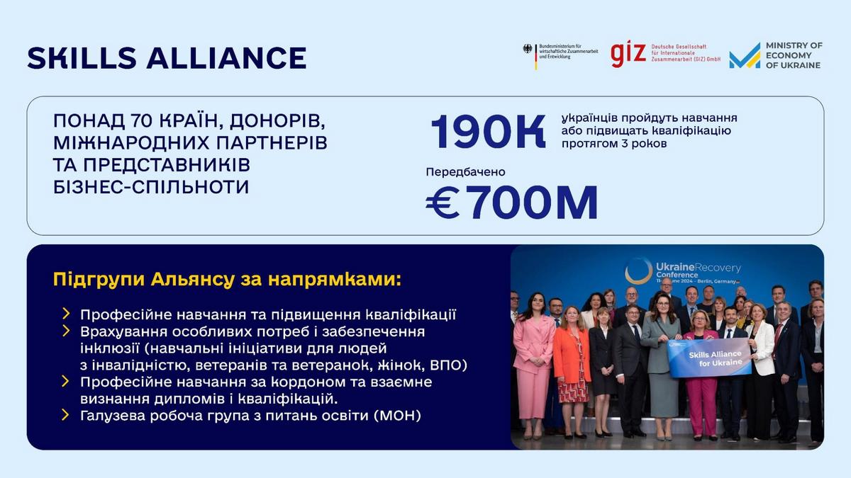 Через місяць спільно з урядом Німеччини Мінекономіки планує запуск великого лендингу, де буде інформація не тільки про державні, але й партнерські (від іноземних організацій та урядів) можливості по перенавчанню. Уряд України активно працює над практичною реалізацією Skills Alliance, за підтримки уряду Німеччини. На цю ініціативу виділено більше 400 млн грн, щоб протягом трьох років понад 190 000 українців змогли опанувати нові професії, затребувані на ринку праці.