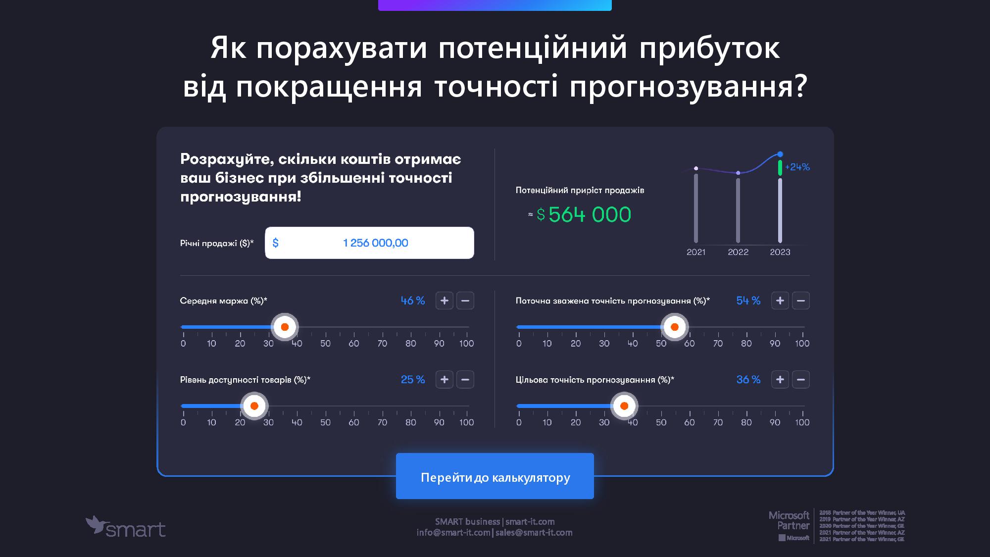 Для розрахунку впливу точного прогнозування на прибуток ми використовуємо інтерактивний калькулятор. В ньому можна задати рівень продажів на рік, середню маржинальность у відсотках і рівень доступності товарів (%). Це дозволить розрахувати потенційний приріст. Це початкові показники.