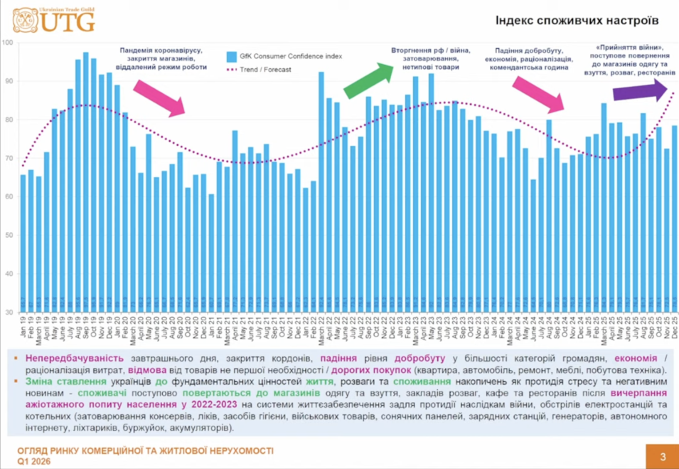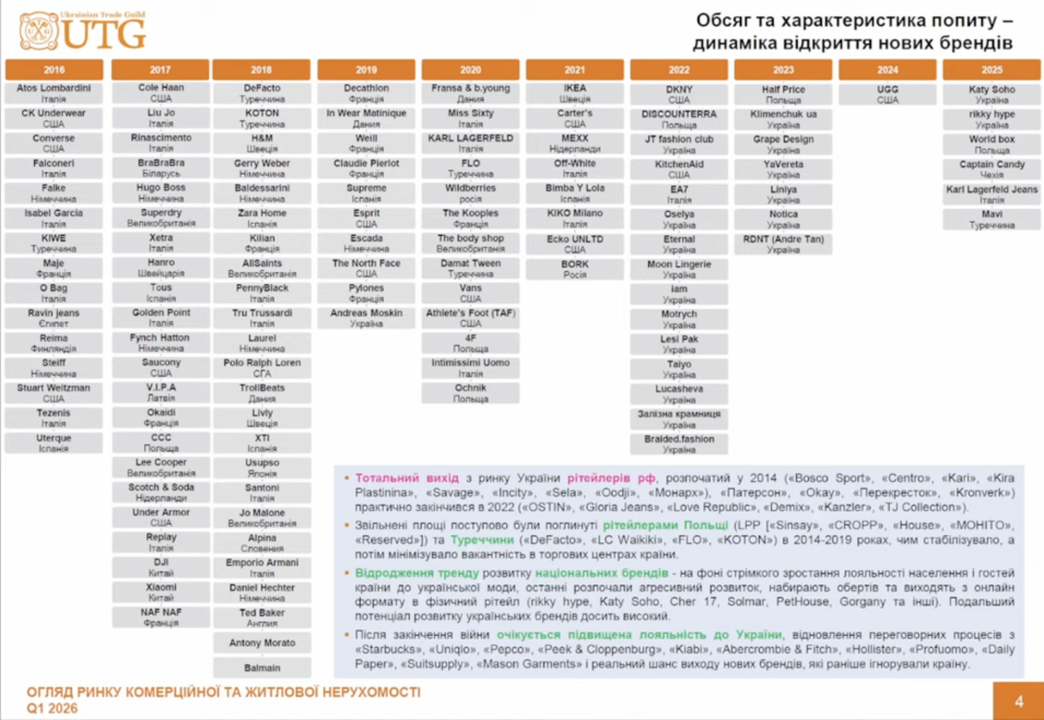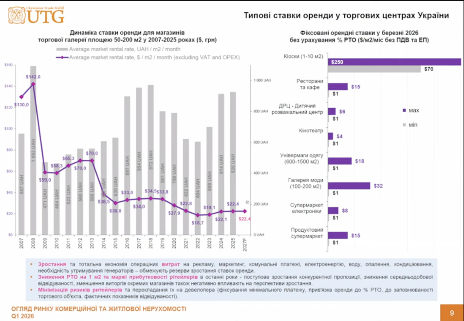 Експерти компанії UTG - Євгенія Локтіонова та Костянтин Олійник під час пресконференції, що відбулася 18 березня, проаналізували, як розвивався ринок торговельної нерухомості у 2025 році. Зокрема, розповіли про зміну географії ритейлу та появу нових форматів роботи, як бізнес адаптувався до роботи під постійним тиском воєнних ризиків, чому загострюється конкуренція та яким вплив проблем із енергопостачанням та дефіциту кадрів на життєздатність торгових майданчиків. Також було зроблено прогноз у галузі на 2026 рік. RAU публікує основне з їх виступу.