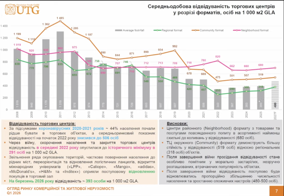 Середня відвідуваність ТРЦ в Україні поступово скорочується через розширення пропозиції площ та розвиток онлайну.