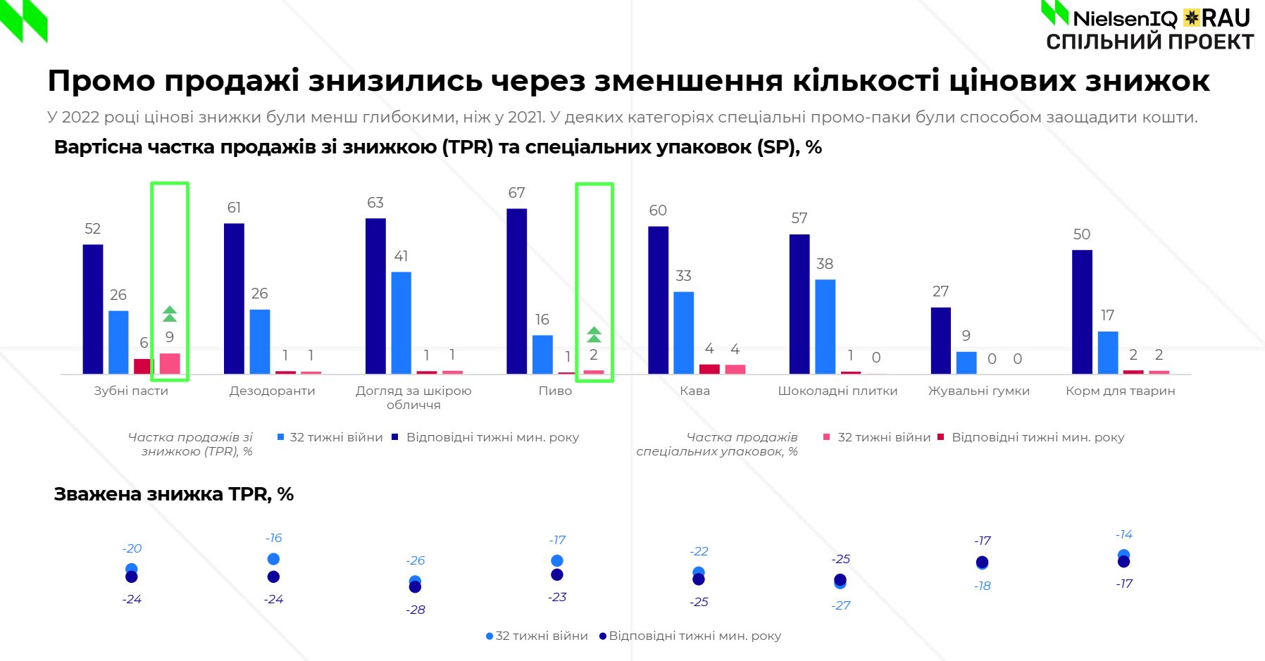 Водночас у 2022 році цінові знижки були менш глибокими, ніж у 2021-му. У деяких категоріях спеціальні промо-паки були способом заощадити кошти. Скажімо, рік тому частка продажів зубних паст зі знижкою була на рівні 52%, а тепер лише 26%. Хоча помітно зростання частки товару в спеціальних упаковках. Найбільш разюча різниця в застосування знижок у категорії пива. Замість торішніх 67% тепер маємо лише 16% частки промо. Тобто зменшення більш ніж учетверо. Подекуди середній розмір знижки значно впав, а в деяких категоріях товарів, як от шоколадні плитки – майже не змінився (25% проти 27% рік тому).