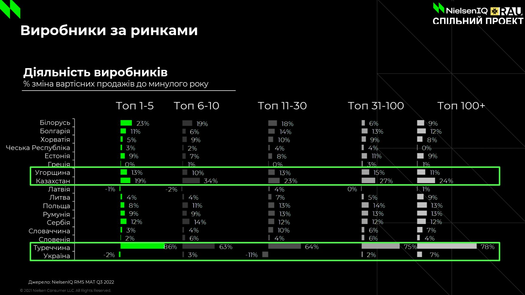 Цікаво також, що серед країн з високим рівнем інфляції Україна, незважаючи всі виклики, знаходиться не на першому місці по зростанню цін на FMCG-товари. Так, у Туреччині, де війни немає, інфляція товарів категорії FMCG перевищує 70% , обороти першої п’ятірки виробників зросли на 86% відносно минулого року. В Україні, де продуктова інфляція більше 28%, продажі першої п’ятірки скоротилися у грошовому виразі на 2%. Так само виділяються на загальному фоні Угорщина та Казахстан.