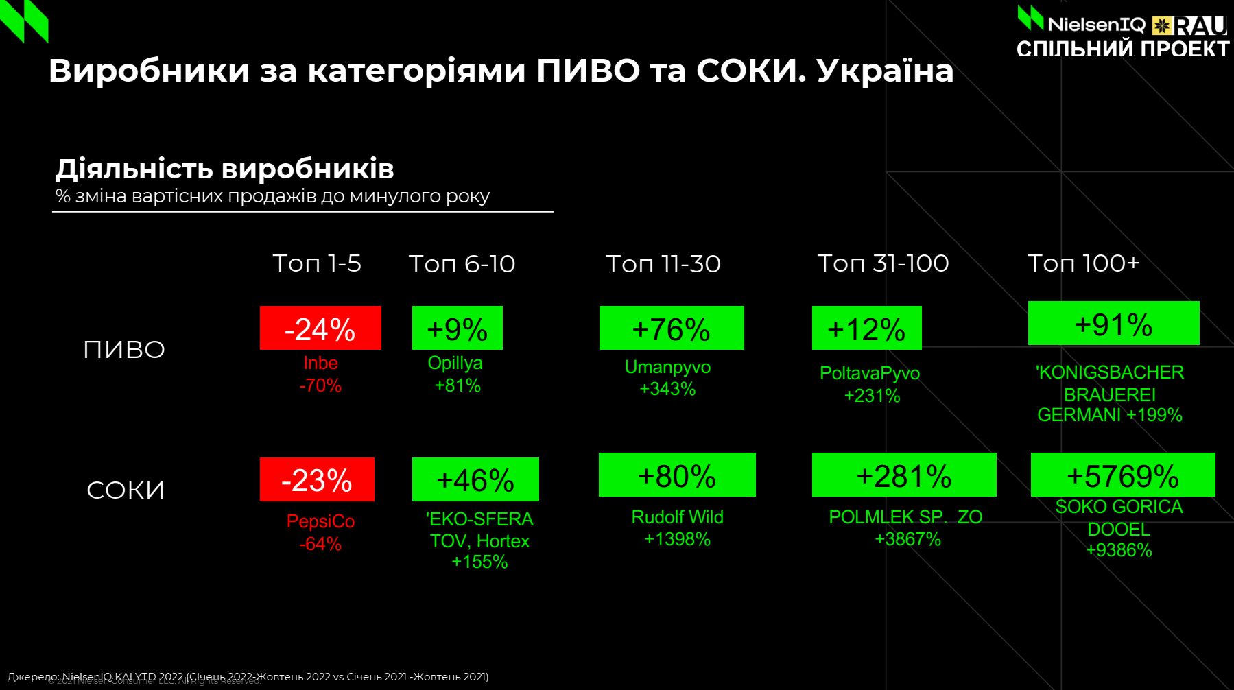 За окремими категоріями товарів в Україні перші топ-5 виробників втратили значно більше ніж декілька відсотків виручки від рівня минулого року. Наприклад, в категоріях «пиво» та «соки» зниження продажів першої п’ятірки виробників становлять відповідно 24% та 23%. Так, компанія AB InBev Efes (броварні в Харкові, Чернігові та Миколаєві) втратила 70% продажів в пиві, а компанія PepsiCo (заводи у Миколаївській області) втратила 64% продажів в соках. Відповідно інші виробники зайняли їх місце на полицях, показуючи великий приріст. Наприклад, Уманьпиво збільшило реалізацію на 343%, а Полтавпиво – на 231%. В категорії соки зміни ще більш вражаючі.