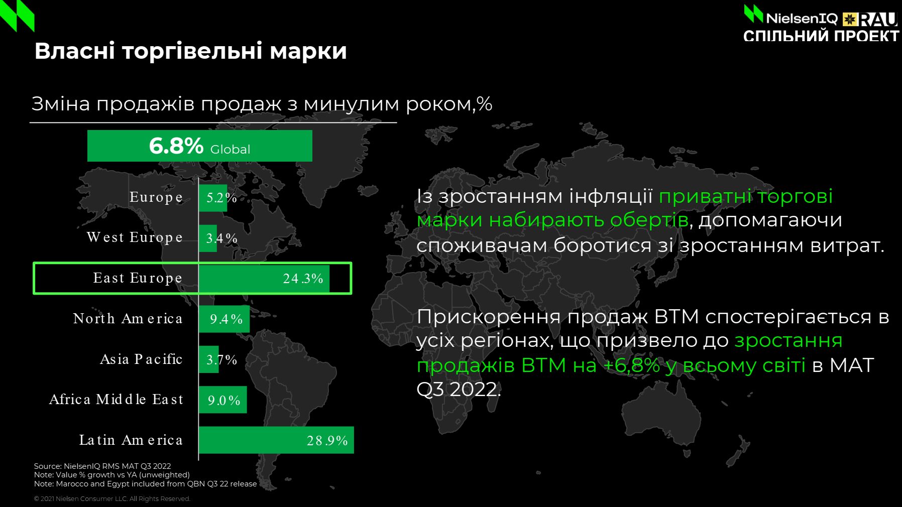 Оскільки в усьому світі ростуть ціни, все більшою популярністю користуються власні торгові марки мереж, які допомагають споживачам боротися зі зростанням витрат. Прискорення продажів ВТМ спостерігається в усіх регіонах, що призвело до зростання їх глобальних продажів на 6,8% якщо порівнювати результати третього кварталу 2022 року з відповідним періодом минулого року. Чим більше рівень інфляції, тим більш стрімко набирають популярності ВТМ, що добре видно на прикладі країн Східної Європи (+24,3%).
