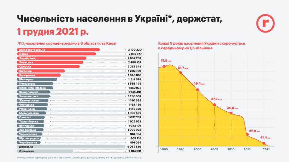 Понад 40% населення України сконцентровано у шести областях та у Києві: