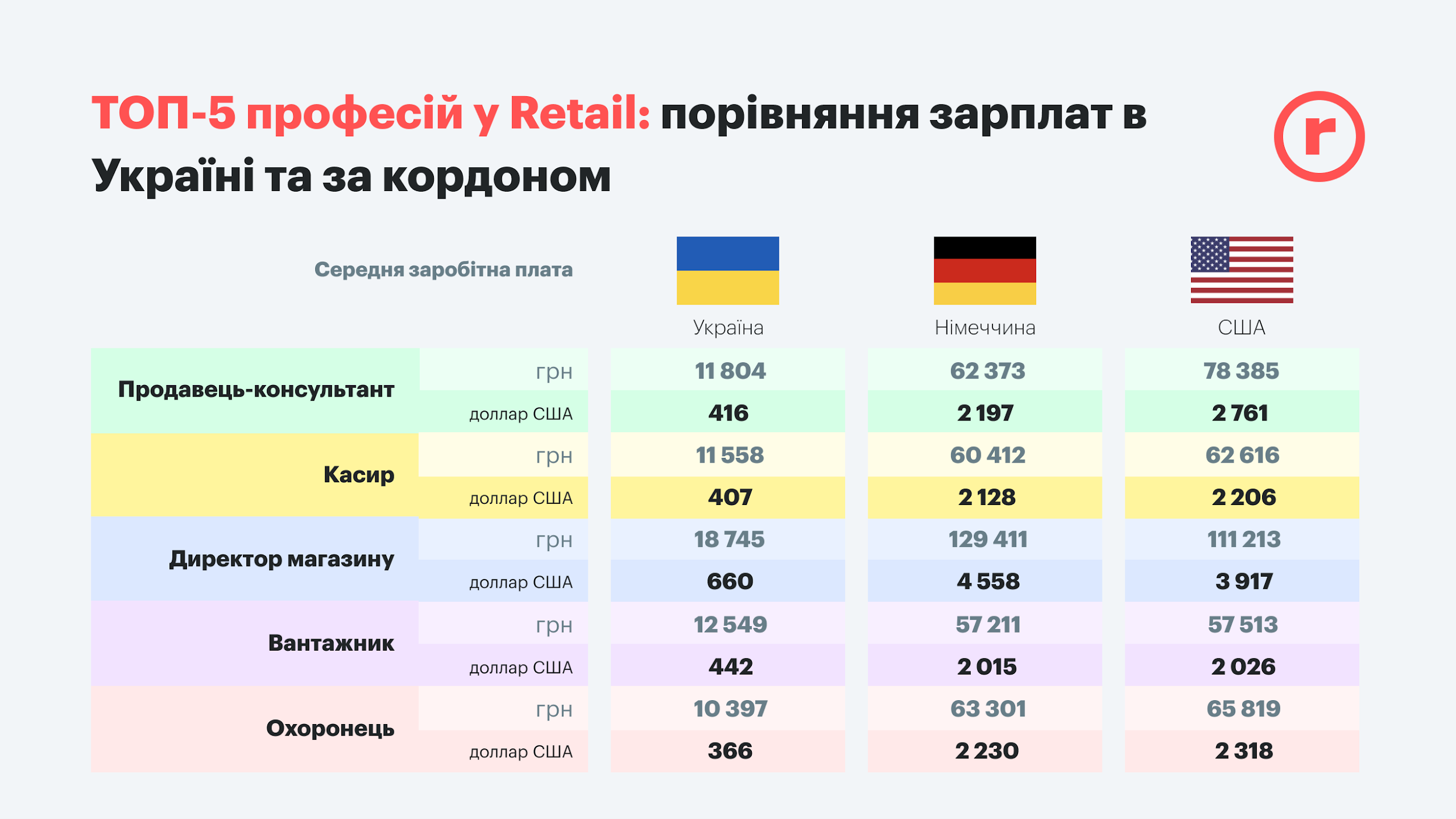 В Україні середня зарплата продавця-консультанта становить 11 800 грн, касира – 11 500 грн, директора магазину – 19 000 грн, вантажника – 12 500, та охоронця – понад 10 000 грн.
