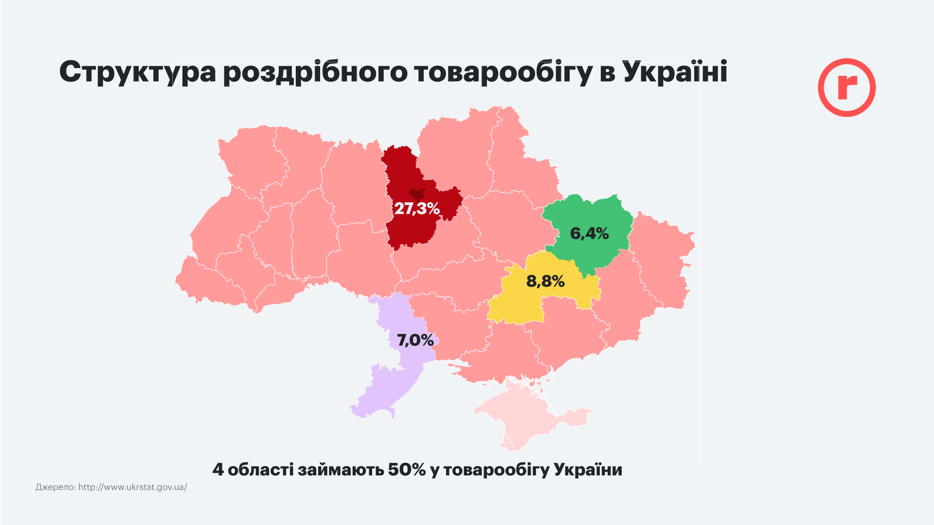 Чотири області України займають частку у 50% у структурі роздрібного товарообігу України: