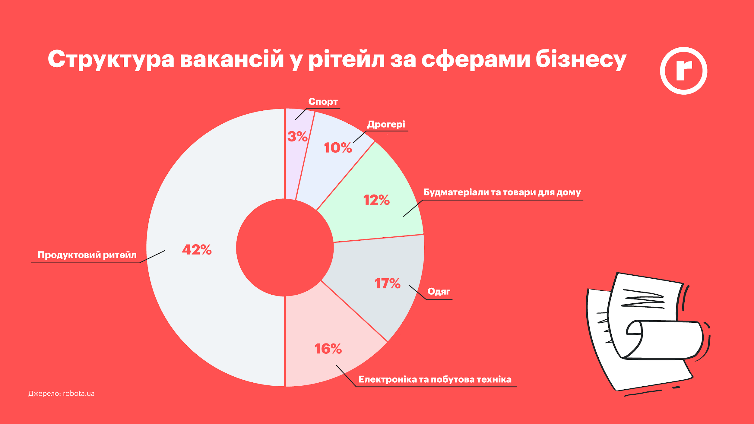 Основним генератором робочих місць є продуктовий рітейл, адже 42% розміщених вакансій стосуються саме цього сегменту, надалі йдуть магазини fashion-рітейлу (17%), магазини електроніки та побутової техніки (16%), магазини будматеріалів і товарів для дому (12%), drogerie (10%) і магазини спорттоварів (3%).