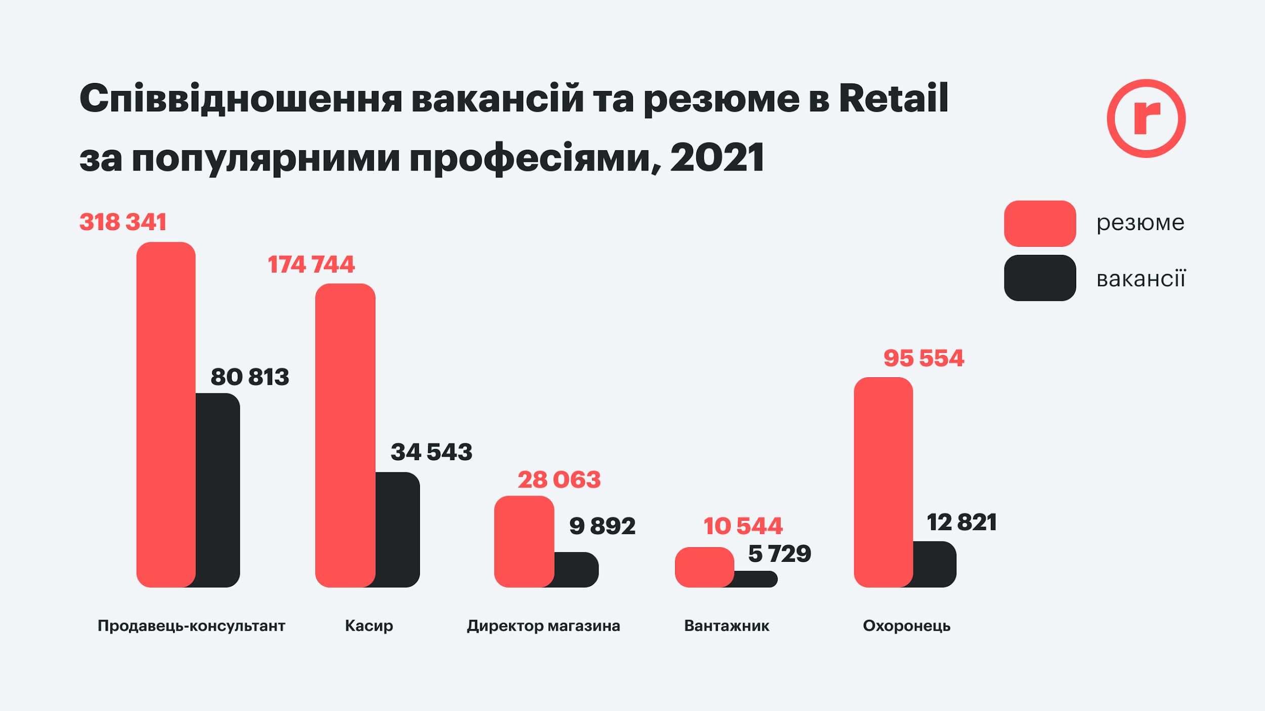 У 2021 році на нашому порталі було розміщено 318 300 резюме продаців-консультантів, 174 700 резюме касирів, 28 000 резюме директорів магазинів, 10 500 резюме вантажників і 95 500 резюме охоронців.