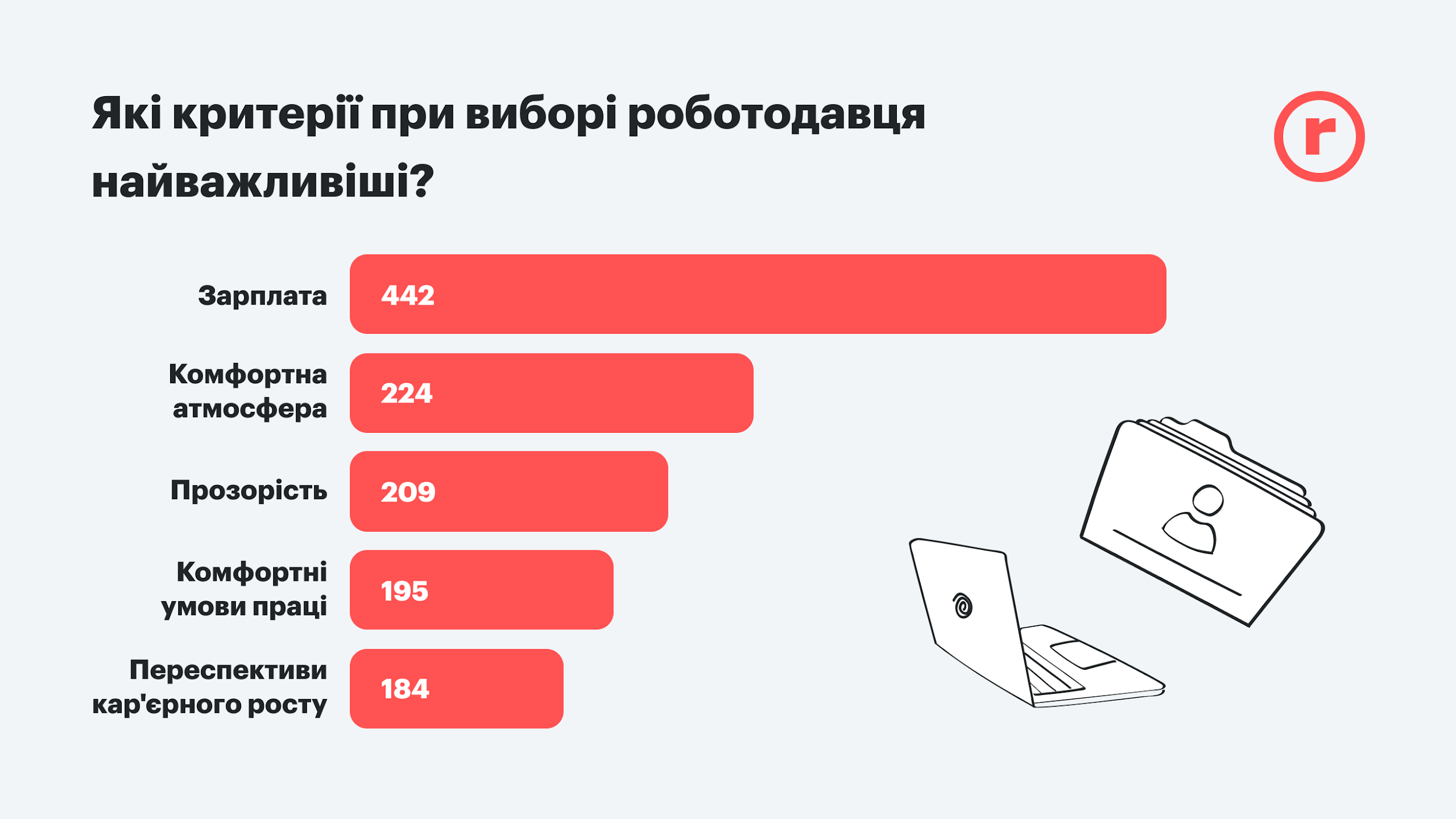 Для цих кандидатів найважливішими критеріями під час пошуку роботи є зарплата, комфортна атмосфера, прозорість роботодавця, умови роботи та перспективи кар’єрного зростання.