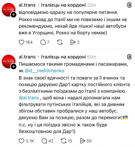 Ну а перевізник, який віз сумнозвісного італійця повідомив, що назад його не повезе. А Дар'ї подарували карту постійного клієнта: