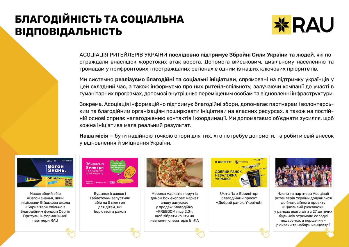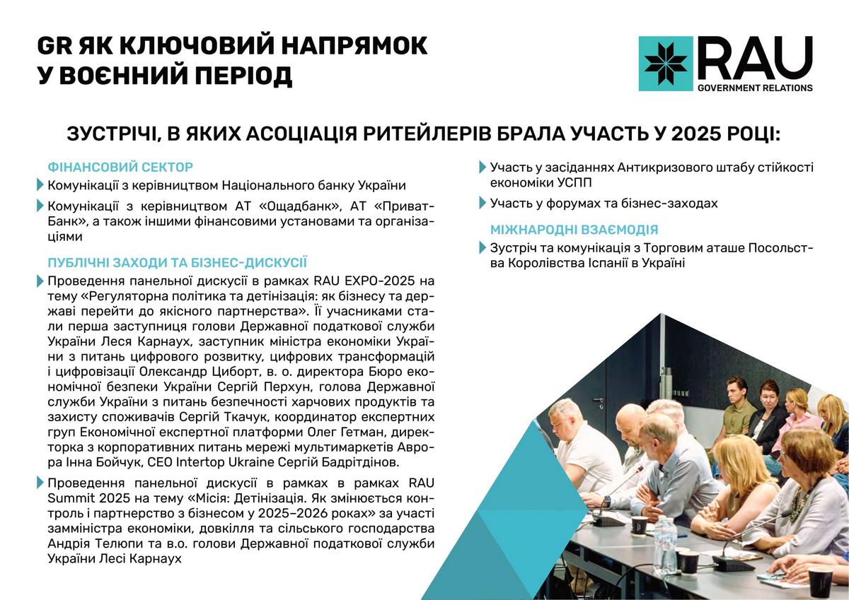 Асоціація ритейлерів України послідовно відстоювала інтереси галузі у взаємодії з органами державної влади. Спільна робота була зосереджена на спрощенні регуляторних процедур, запровадженні механізмів е-бронювання для захисту критично важливих працівників, удосконаленні законодавчого поля та ініціатив, спрямованих на забезпечення продовольчої безпеки, розвиток інфраструктури й створення сприятливих умов для розвитку ритейлу в Україні. Підтримка Збройних Сил України та співпраця з громадами залишаються незмінними пріоритетами. За понад три роки війни українські ритейлери передали допомоги на суму понад 18,1 млрд грн.
