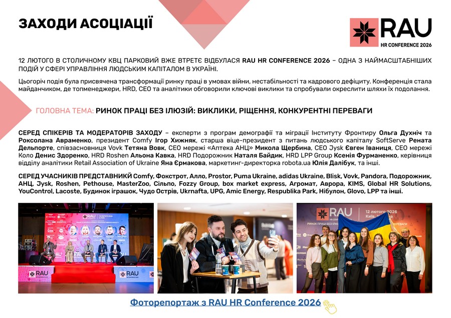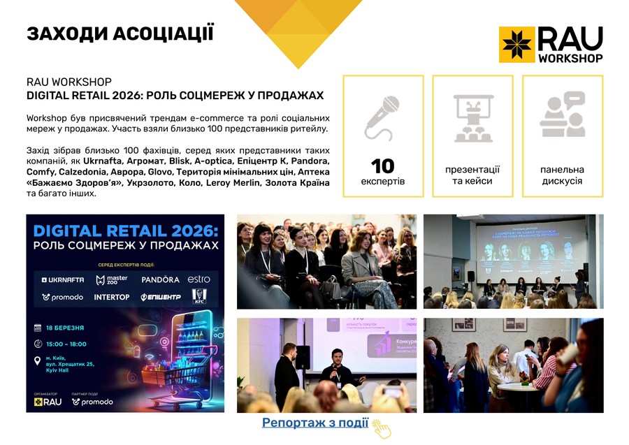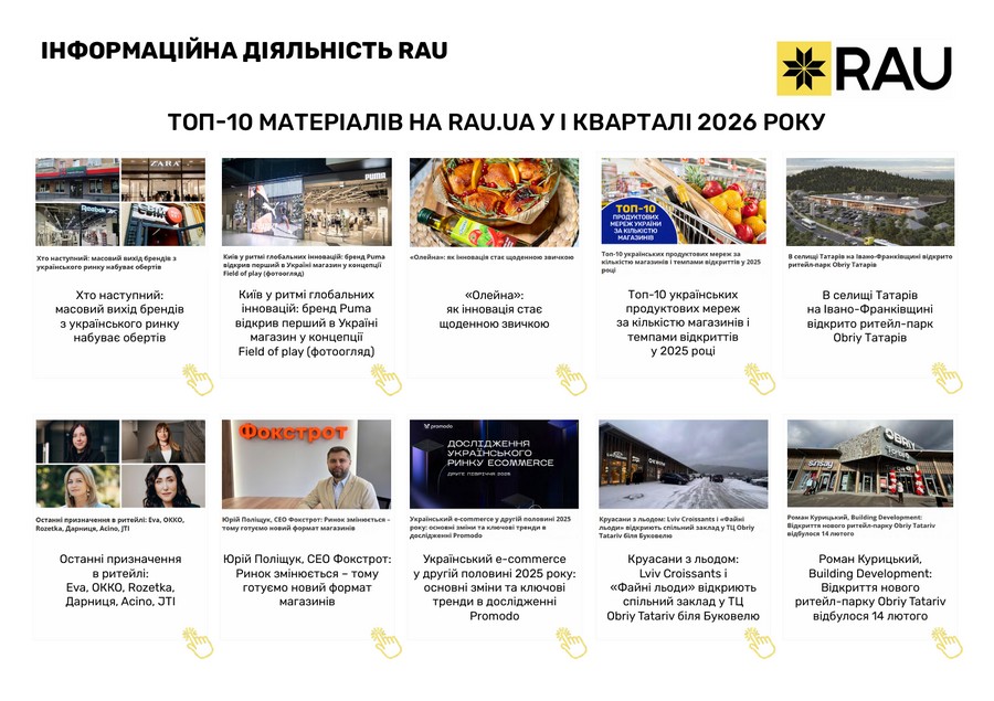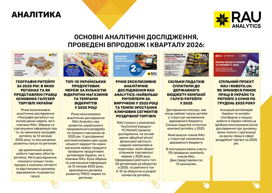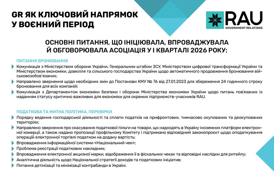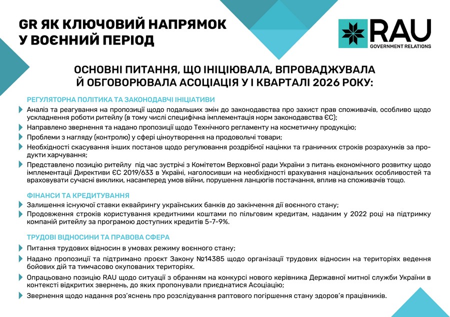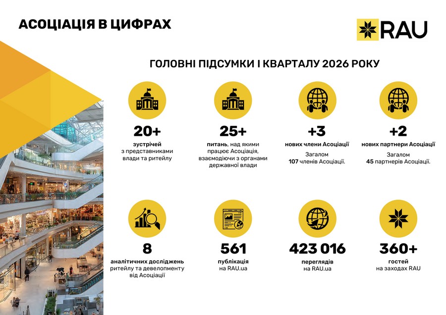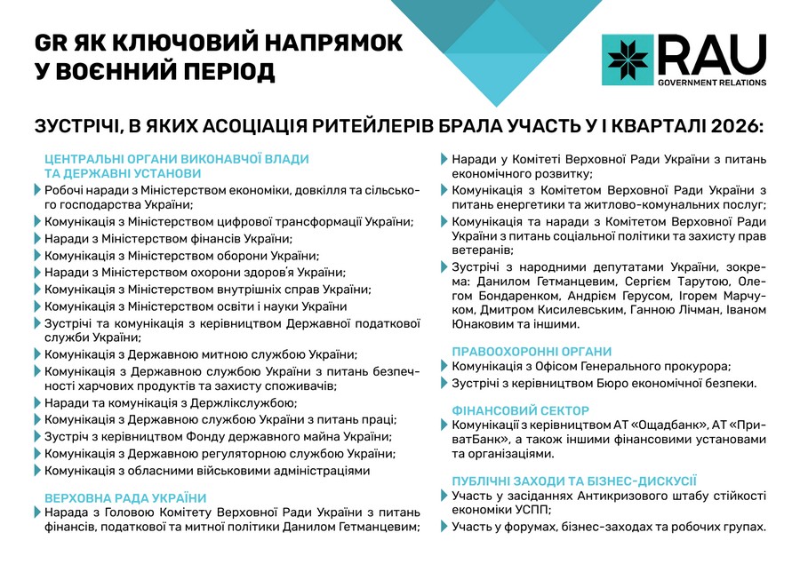 Підсумки роботи Асоціації ритейлерів України у І кварталі 2026 року в цифрах та графіках: які члени та партнери приєднались до RAU, які заходи проведено, скільки статей було опубліковано, які аналітичні дослідження вдалося реалізувати, які зустрічі з владою організувала GR-команда, що було зроблено та які результати отримано.