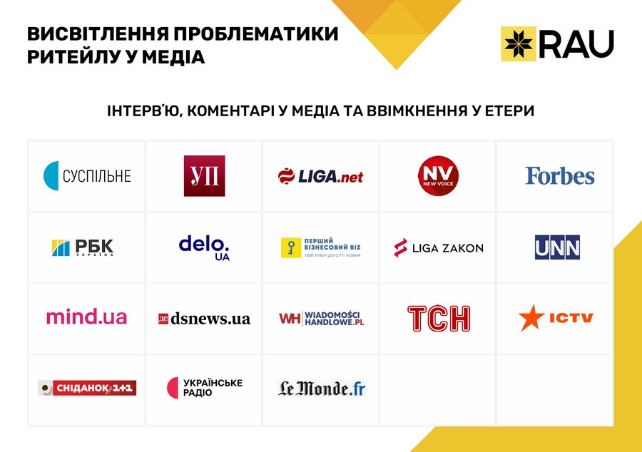За даними дослідження RAU серед 109 членів Асоціації, у 2025 році в Україні працювало 24 549 торговельних точок у восьми ключових галузях. За рік ритейл відкрив 2234 нових магазинів, водночас було закрито 683, а чистий приріст склав +1551 точку. Загальний виторг галузі досяг 2,09 трлн грн (без ПДВ), що на 17,6% більше у фактичних цінах, ніж у 2024 році. При цьому члени Асоціації забезпечили