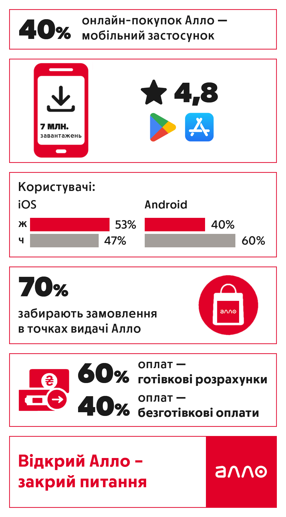 Доля онлайн-продаж на маркетплейсе Алло растет из года в год благодаря популярности мобильного приложения. На конец 2024 года 40% всех онлайн-покупок на маркетплейсе приходилось именно на него. В общем пользователи загрузили приложение Алло свыше 7 миллионов раз, оставляя положительные отзывы и оценив его в App Store и Google Play на 4,8 баллов.