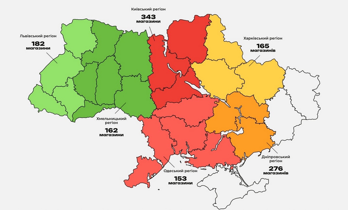 Средняя площадь магазина составляет 600–700 кв. м (средняя торговая – около 450 кв. м). Крупнейший магазин компании, площадью 1173 кв. м на девять касс работает в Одессе. Самый маленький находится в Кропивницком и занимает всего 148 кв. м и три кассы.