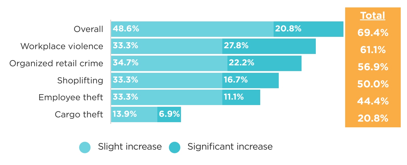 Пандемия COVID-19 повлияла на риски в ритейле сразу по нескольким направлениям. Особо отмечается рост насилия по отношению к персоналу (61%) и организованной преступности в сфере розничной торговли (57%).
