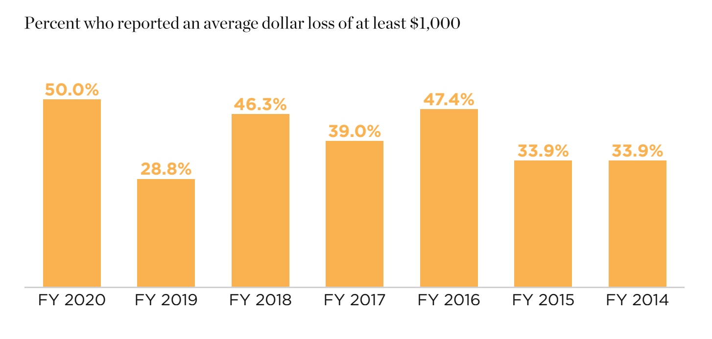 Цена ущерба, нанесенного одним работником, также выросла. Половина (50%) респондентов сообщили о среднем убытке не менее чем в $1000 по сравнению с 29% в 2019 году. Впрочем, нечто похожее наблюдалось и в 2016-м, и в 2018 году.
