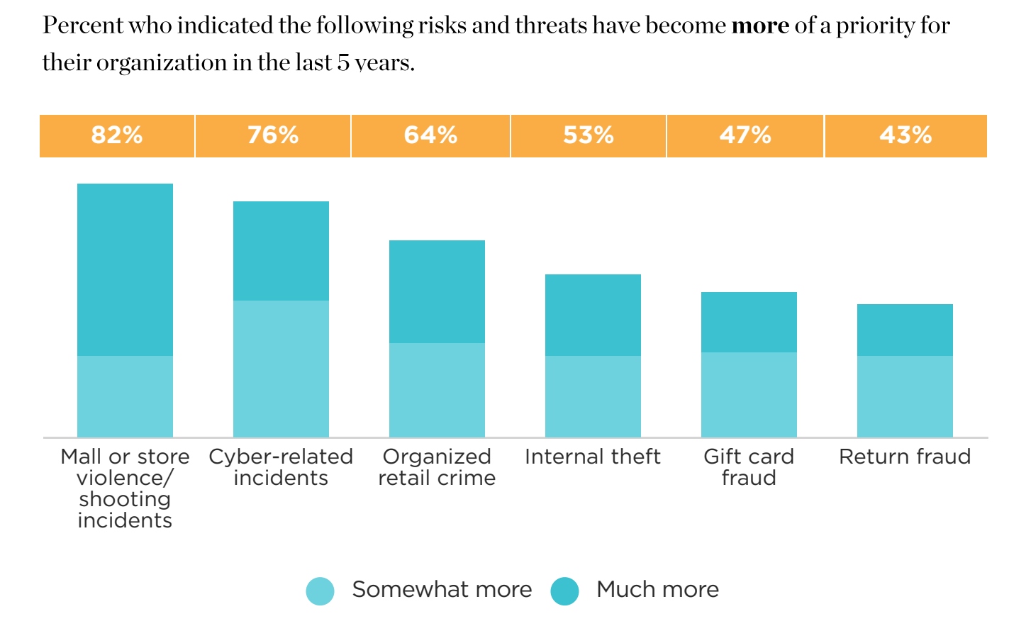 На вопрос, какие области стали более приоритетными за последние пять лет, профессионалы указали на насилие в торговых центрах и магазинах наряду с киберинцидентами и организованную преступность.