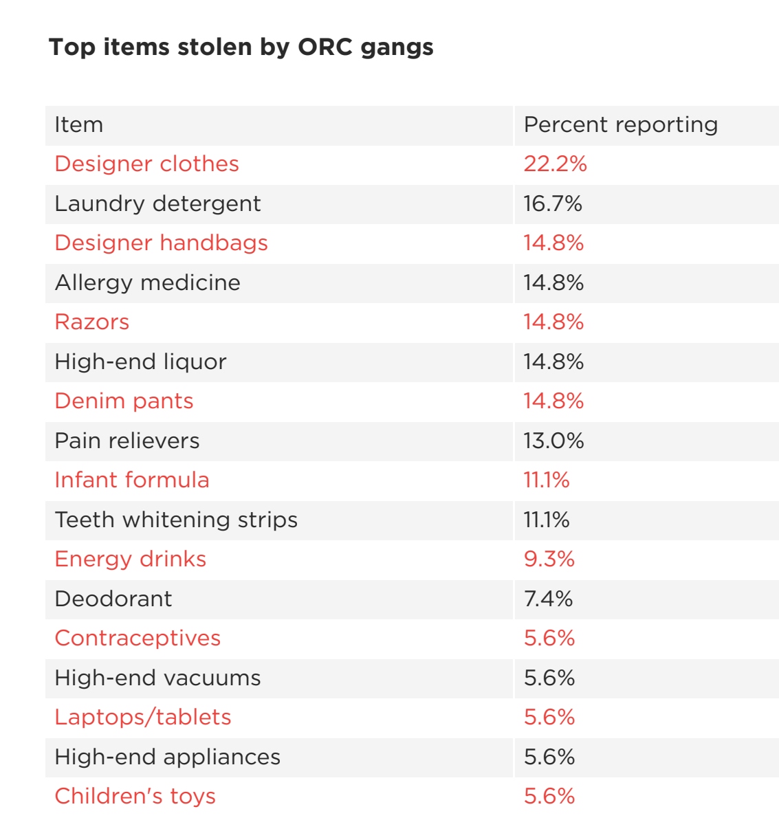 Банды нацелены на кражу самых разных товаров, включая дизайнерскую одежду (по данным 22% респондентов), стиральные порошки (17%), дизайнерские сумки, лекарства от аллергии, бритвы и элитные спиртные напитки (по 15% каждая), обезболивающие средства (13%), детское питание и полоски для отбеливания зубов (по 11% каждая).