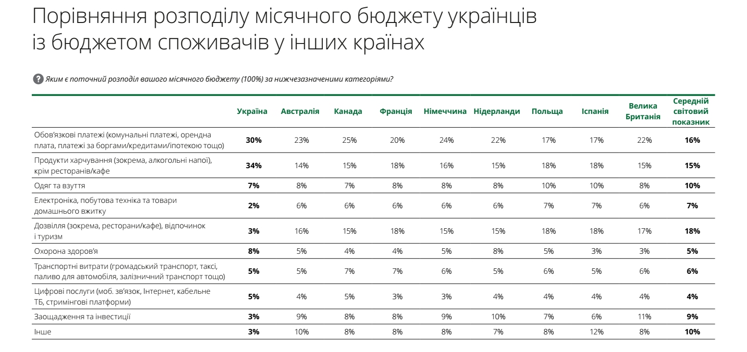 Война и экономическая нестабильность продолжают менять потребительские привычки украинцев. На третий год полномасштабной войны украинцы снова адаптировались и пересмотрели свои приоритеты при выборе товаров и услуг. В частности, наблюдается рост расходов на самые важные товары: 37% респондентов отмечают, что больше стали тратить на продукты питания и медикаменты. Хотя, как и в прошлом году, обязательные платежи и расходы по базовым потребностям (продукты питания, здравоохранение и транспорт) занимают большую часть месячного бюджета. Это составляет 77% общих затрат, что в 1,8 раза больше среднего мирового показателя (42%) и значительно превышает средний показатель в европейских странах. К примеру, в Польше эта доля составляет 46%, а в Германии – 51%.
