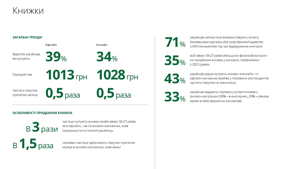 Также впервые в исследовании было проанализировано покупательное поведение украинцев по книгам. Оказалось, что каждый третий опрошенный покупает их в онлайн-магазинах, по крайней мере, раз в два месяца, тратя в среднем 1028 грн за одну покупку.