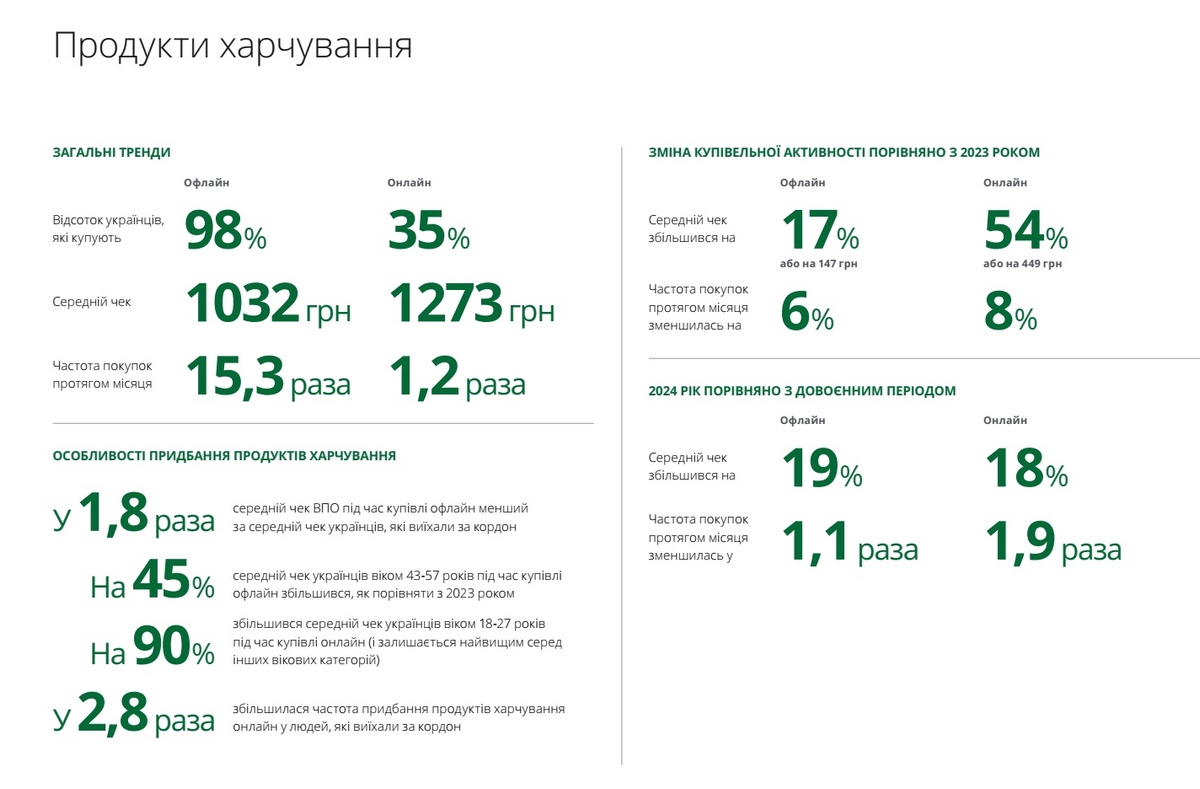 В 2024 году уровень инфляции достиг 12%, что, конечно, повлияло на поведение потребителей, но исследователи больше сосредоточились на других факторах изменений. В частности, продукты питания все чаще стали покупать онлайн, а средний чек вырос на 54% до 1273 грн. Чаще других покупают продукты онлайн молодые люди от 18 до 27 лет – их средний чек увеличился на 90%.
