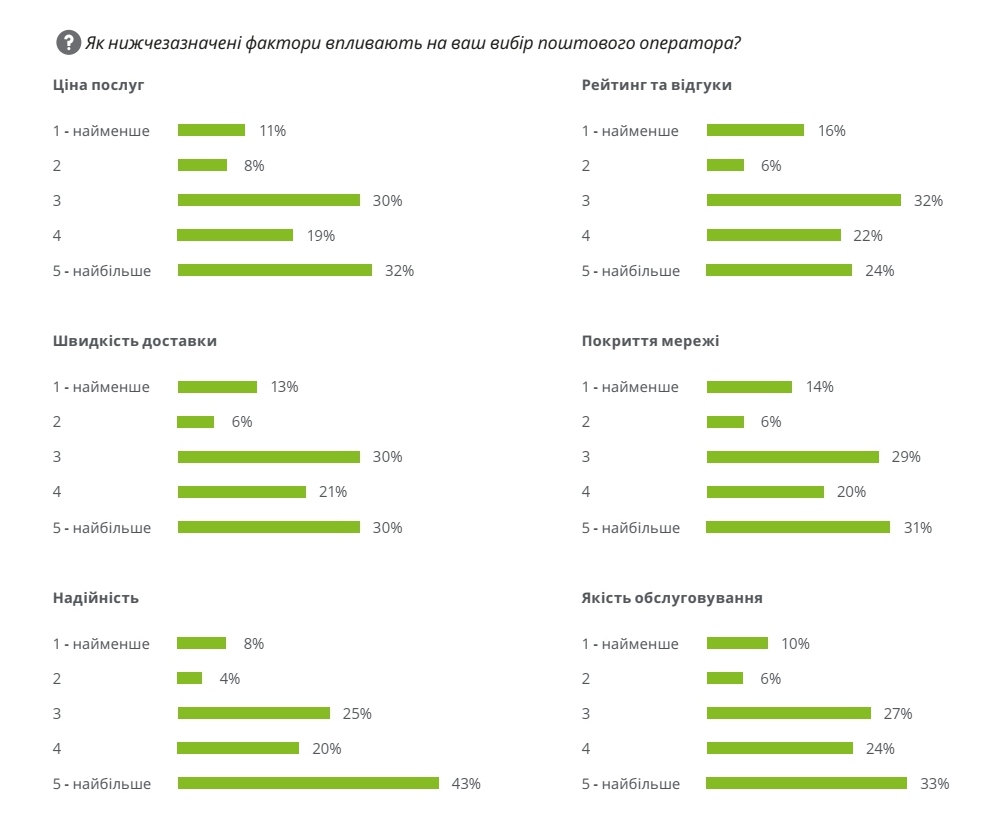 При выборе почтового оператора украинцы больше всего руководствуются критериями надежности (88%) и ценами услуг (81%). Для людей старше 43 лет и жителей северного региона надежность является приоритетом, тогда как для киевлян и жителей столичного региона определяющим фактором остается цена. Интересно, что скорость доставки (30%) оказалась менее значима для большинства респондентов, но критически важна для пенсионеров, работников коммерческих и неприбыльных организаций.