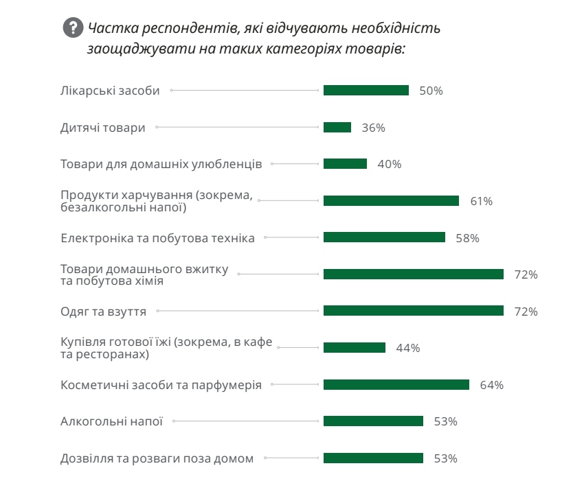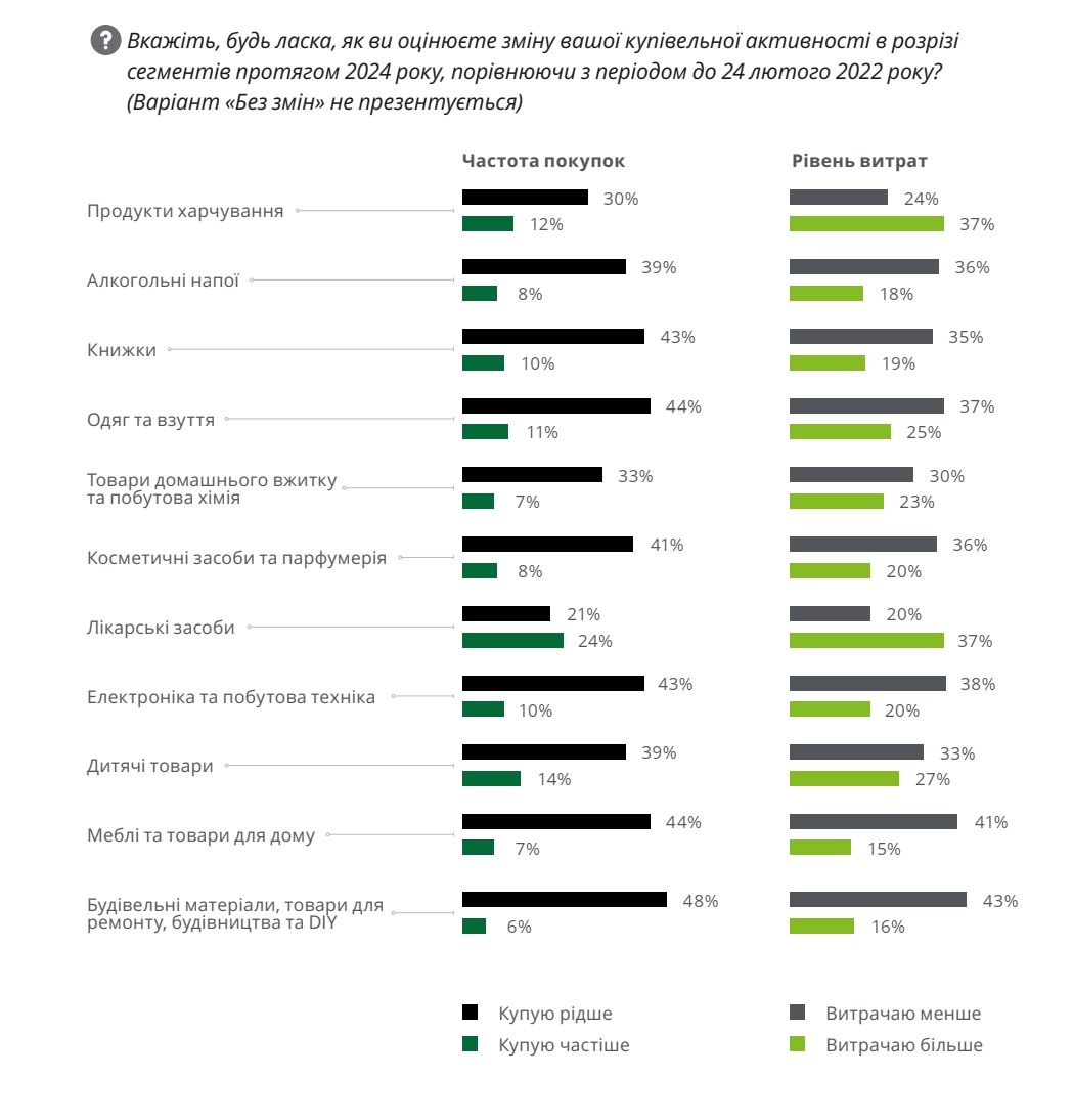 Вместе с тем спрос на лекарственные средства продолжает расти – 24% украинцев покупают их чаще, чем в прошлом. Это единственная категория, приросшая по частоте покупок. Соответственно на медикаменты увеличили расходы 37% опрошенных – так же, как и на продукты питания, хотя продукты украинцы стали покупать реже. Во всех остальных категориях украинцы сократили свои расходы.