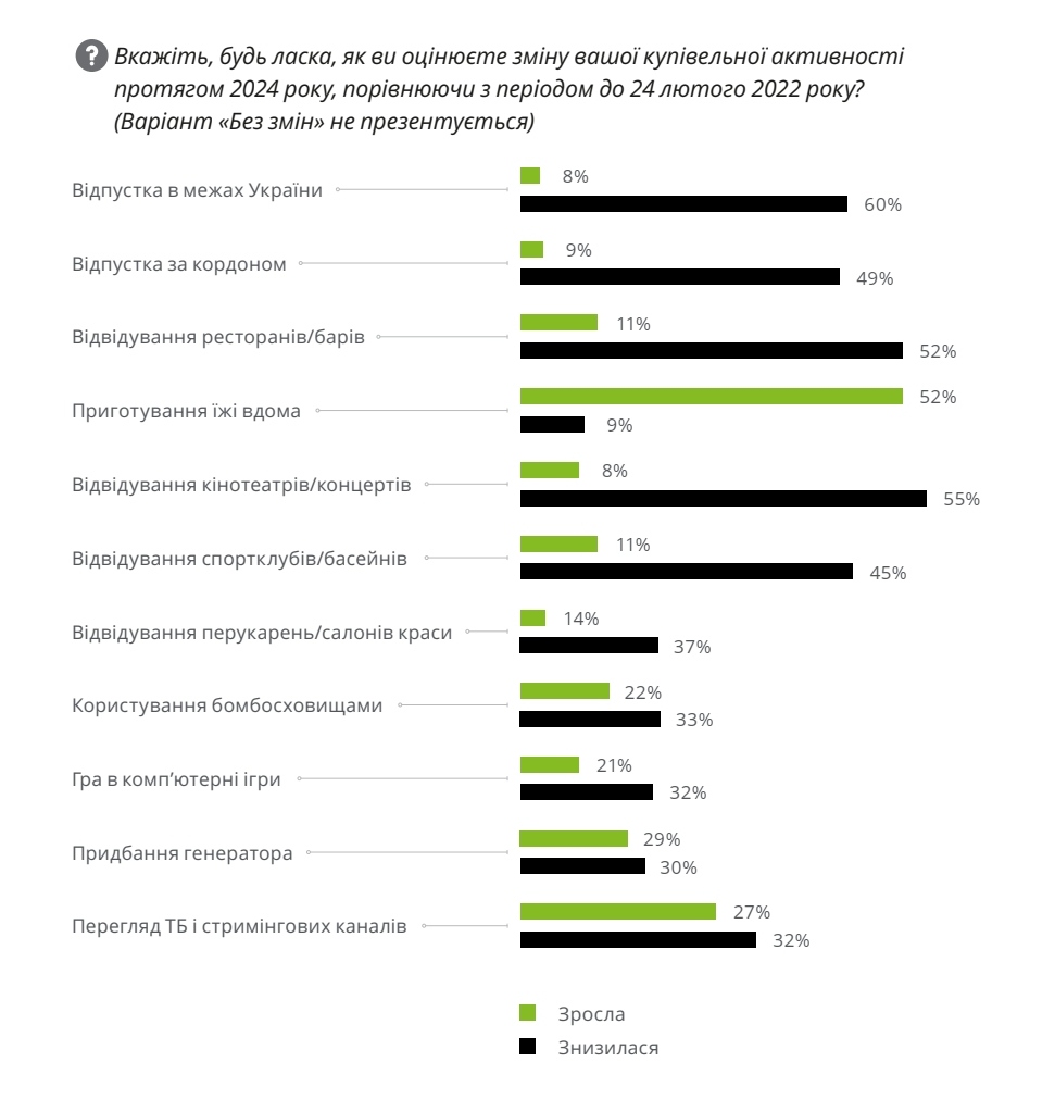 Хотя более половины (52%) украинцев все еще говорят о сокращении количества своих походов в рестораны и бары, это на 3% меньше, чем в 2023 году (55%). Существенное снижение посещаемости ресторанов/баров наблюдается в населенных пунктах размером от 100 000 до 1 млн человек. Интересно, что теперь количество тех, кто чаще стал готовить на дому, тоже составляет 52% (в 2023 году этот показатель составлял 50%).