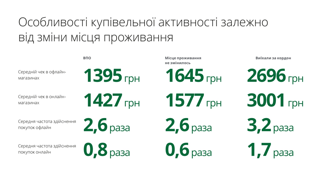 Напомним, что в 2022 году внутренне перемещенные лица (ВПЛ) были лидерами по среднему чеку в 13 категориях из 21. Также украинцы, находящиеся за рубежом, являются безоговорочными лидерами по частоте покупок во всех категориях товаров, кроме лекарственных средств и продуктов питания.