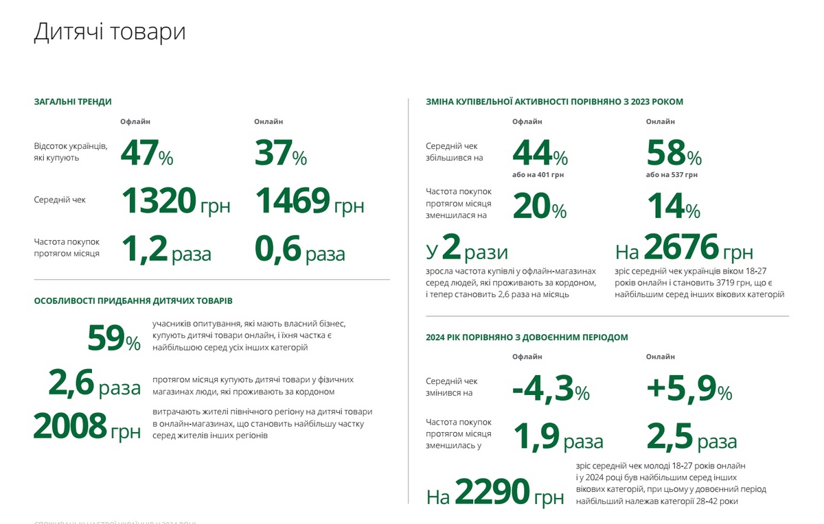 Заметно увеличились покупки детских товаров в обоих каналах – средний офлайн чек вырос на 44% и на 58% онлайн. В среднем украинцы тратили в обычных магазинах 1320 грн в 2024 году, что на 401 грн больше, чем в 2023 году и на 60 грн меньше, чем в довоенный период. Онлайн украинцы тратили в среднем 1469 грн., что на 537 грн. больше, чем в 2023 году, и даже на 82 грн. больше, чем в довоенный период.