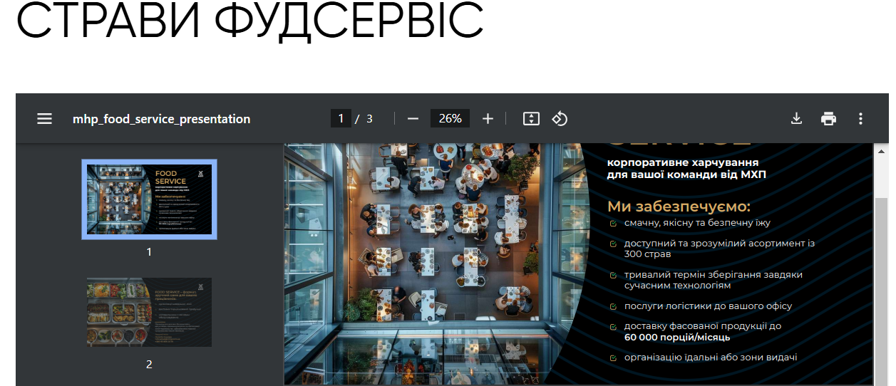 Основная деятельность холдинга МХП сосредоточена в таких сегментах как птицеводство, мясопереработка и животноводство. А в 2020 году МХП взял курс трансформации из сырьевой компании в кулинарную. Компания начала развивать новые форматы розничной торговли, например: сеть М’ясомаркет и точки по продаже шаурмы Doner Market. А в ноябре 2024 года стало известно, что МХП запускает новое food-направление – MHP Food Service, которое поможет другим бизнесам позаботиться о питании своих работников, а сервисам доставки, операторам столовых и ивент-кейтерингам – масштабироваться. Проект будет иметь два направления: первое – услуга корпоративного питания для бизнесов, которые хотят позаботиться о работниках.