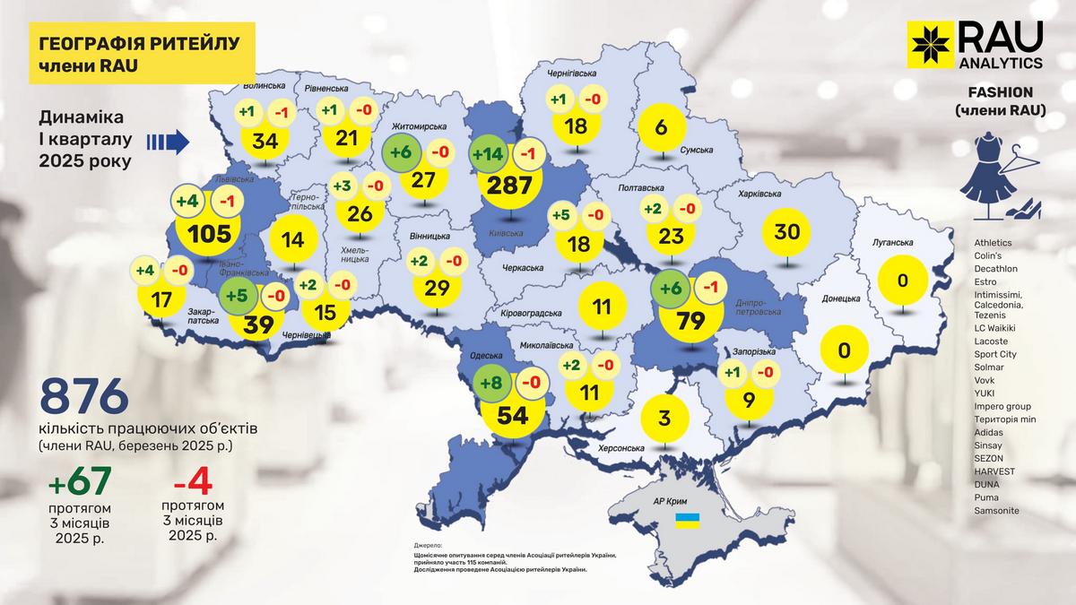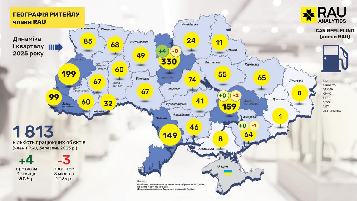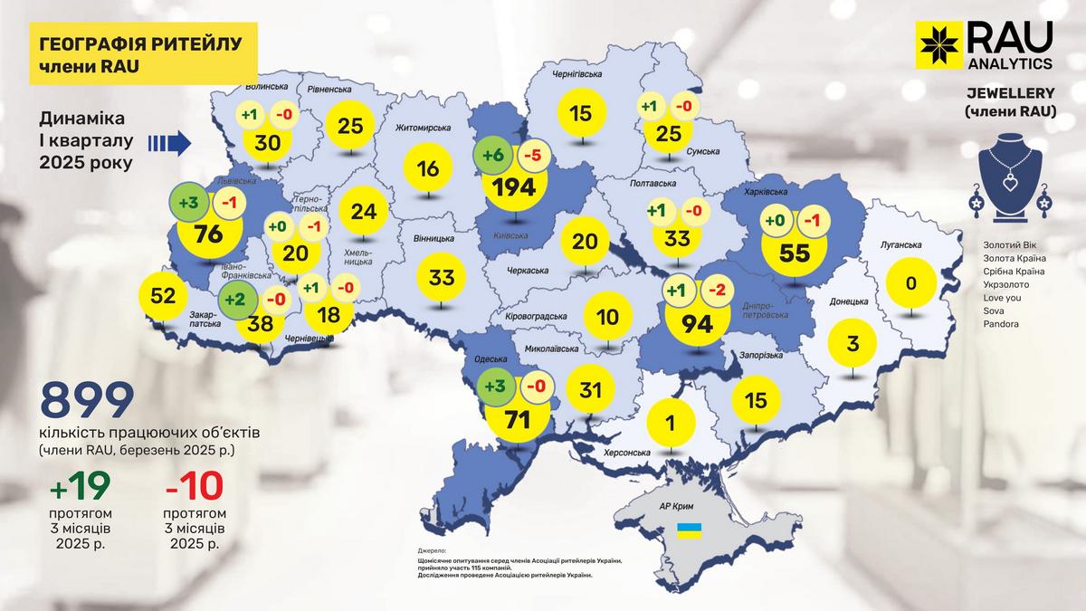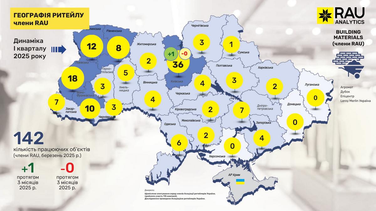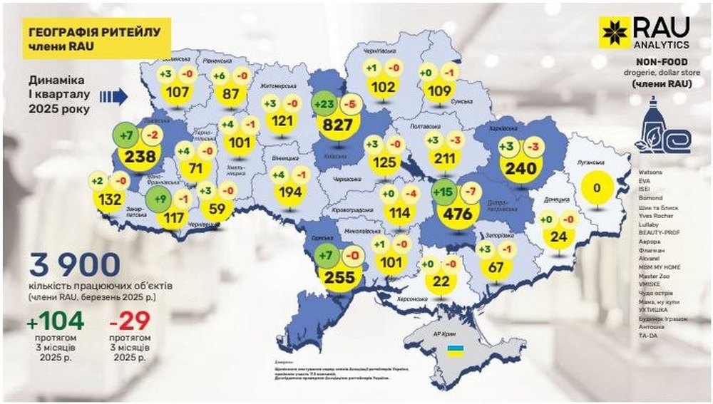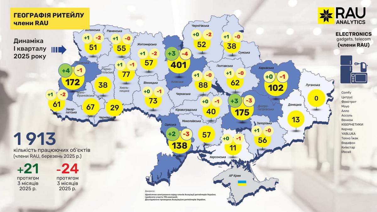 Retail Association of Ukraine представляет очередное эксклюзивное аналитическое исследование под названием “География ритейла”. На основе данных сетей, являющихся членами RAU, была собрана и обобщена информация о том, как изменилась география ритейла в I квартале 2025 года и какова динамика развития отрасли по регионам.