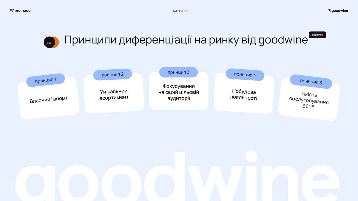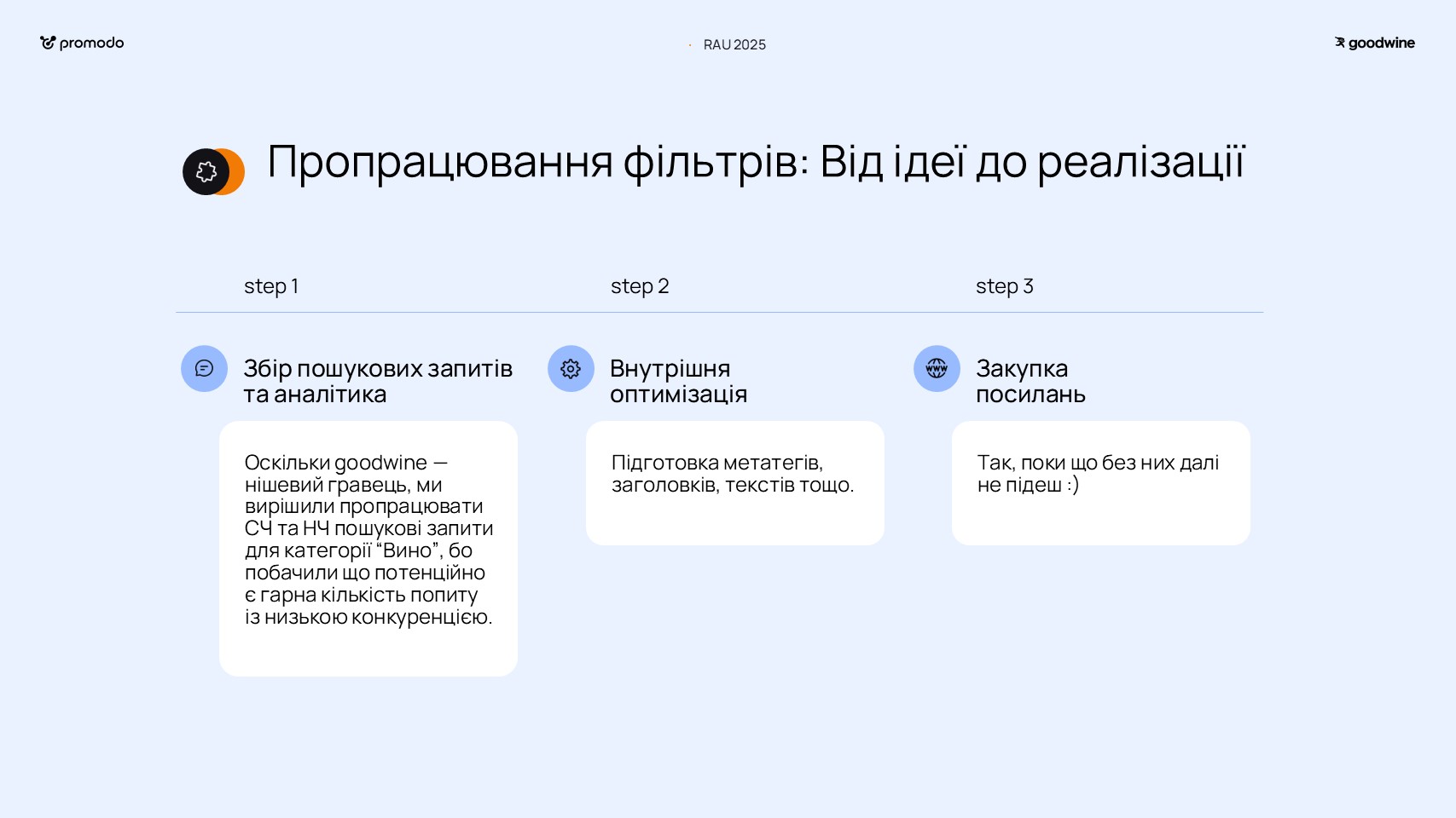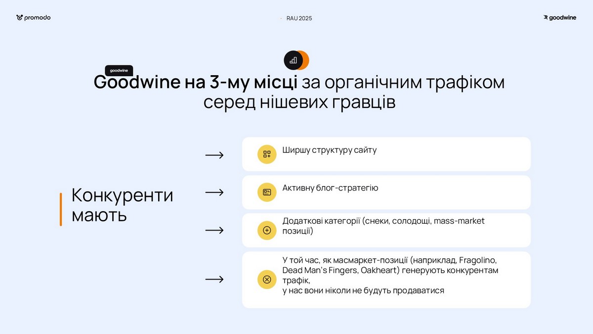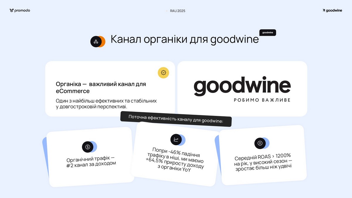 Вместе с командой Goodwine SEO Team Lead Promodo Владислав Тришкин раскрыли некоторые секреты работы онлайн в нише с большой конкуренцией. В частности, операционный директор e-commerce Goodwine Григорий Молодчик и Head of Digital Marketing Goodwine Олеся Мирус представили кейс Promodo & Goodwine на тему “Как привлекать трафик и получать продажи, если вы не большой маркетплейс”. RAU представляет основные положения.