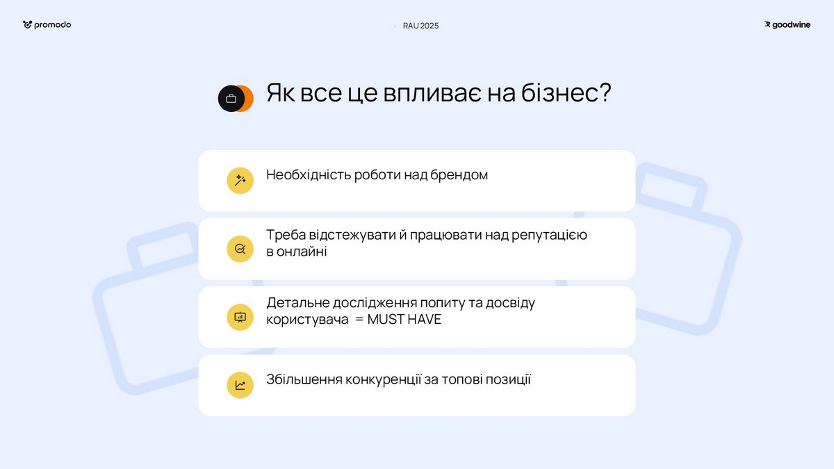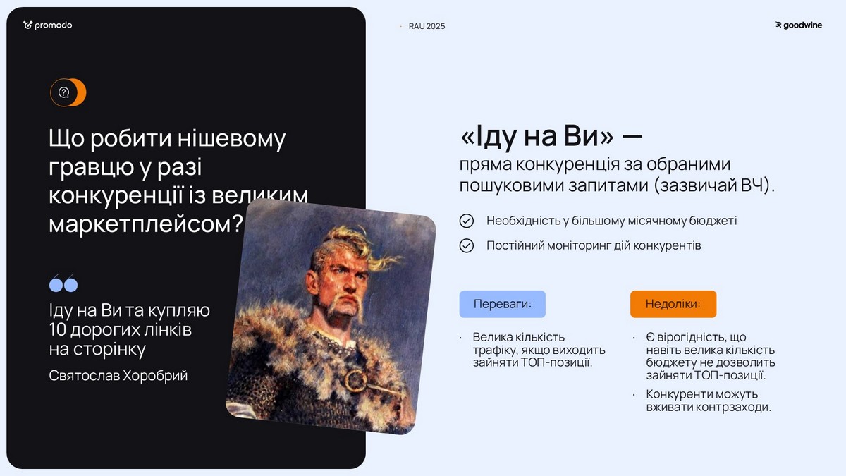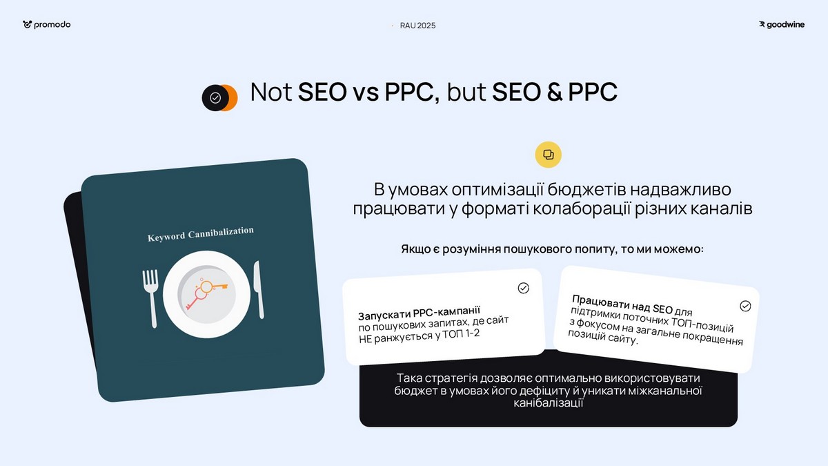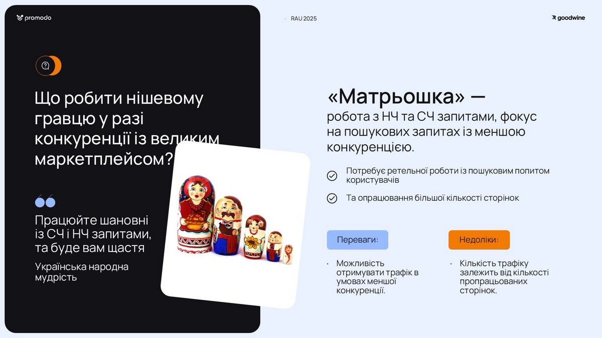 Вместе с командой Goodwine SEO Team Lead Promodo Владислав Тришкин раскрыли некоторые секреты работы онлайн в нише с большой конкуренцией. В частности, операционный директор e-commerce Goodwine Григорий Молодчик и Head of Digital Marketing Goodwine Олеся Мирус представили кейс Promodo & Goodwine на тему “Как привлекать трафик и получать продажи, если вы не большой маркетплейс”. RAU представляет основные положения.
