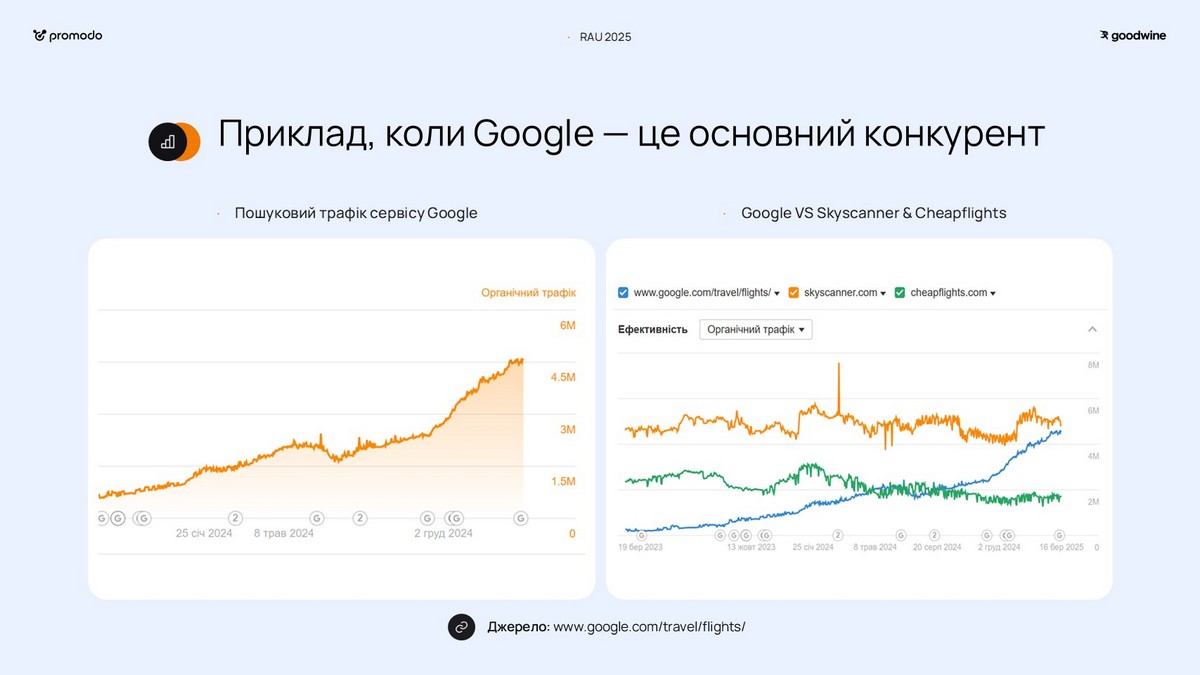 Это усугубляет конкуренцию, в том числе и за счет самого Google. Поскольку главная задача поисковика – максимально быстро удовлетворить запрос пользователя еще на этапе скроллинга результатов поиска (т.е. без захода на страницу с необходимой информацией). Ниже пример конкуренции сервиса Google с сервисами поиска дешевых авиаперелетов, когда за полтора года он увеличил количество кликов с 800 000 до 5 млн в месяц.