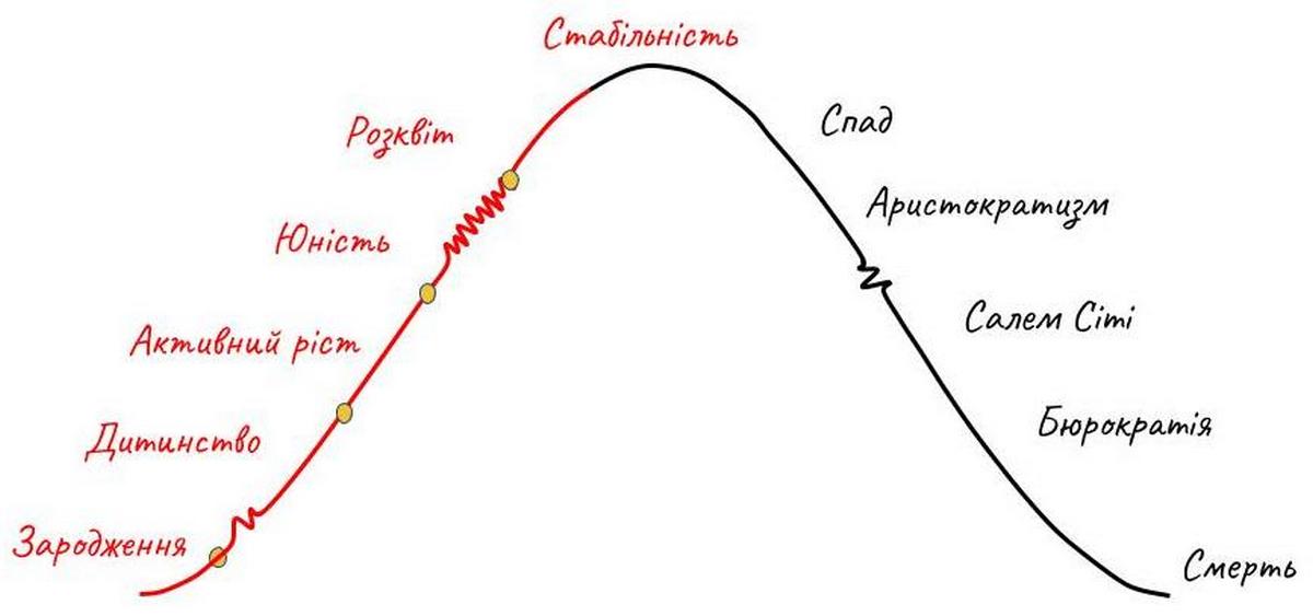 На каждом этапе развития есть основные процессы. Их можно пройти быстро, нивелировав негативные эффекты, либо задержаться надолго при не очень умелом управлении. В своей книге «Управление жизненным циклом корпорации» Ицхак Адизес представил теорию таких жизненных циклов и принципы осуществления организационных изменений, которые он разработал и применял на практике в течение 30 лет. Модель уровней зрелости выглядит следующим образом.