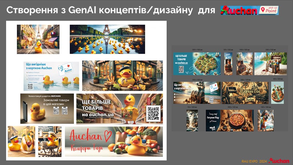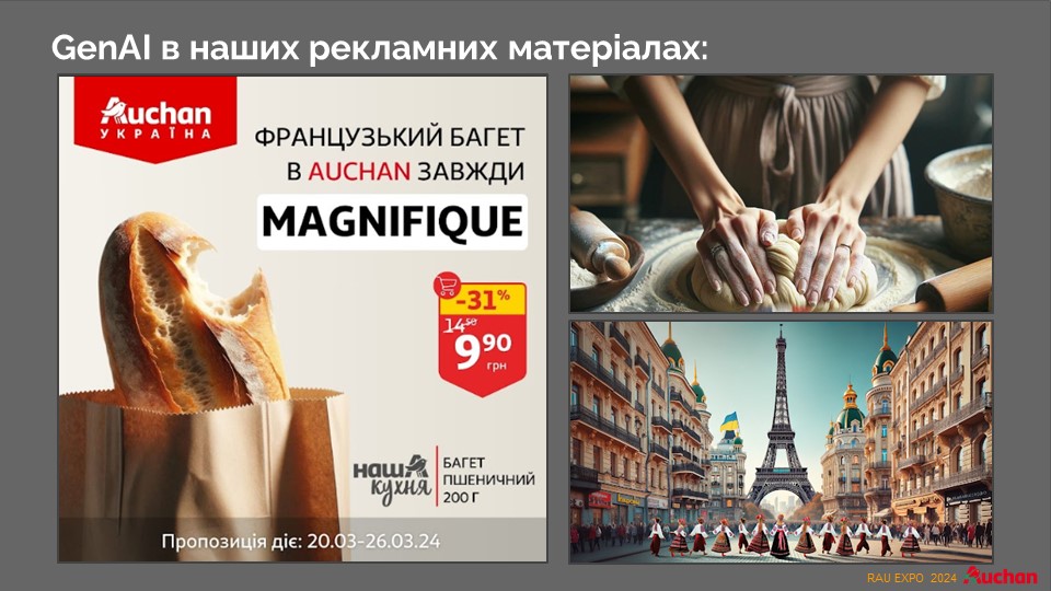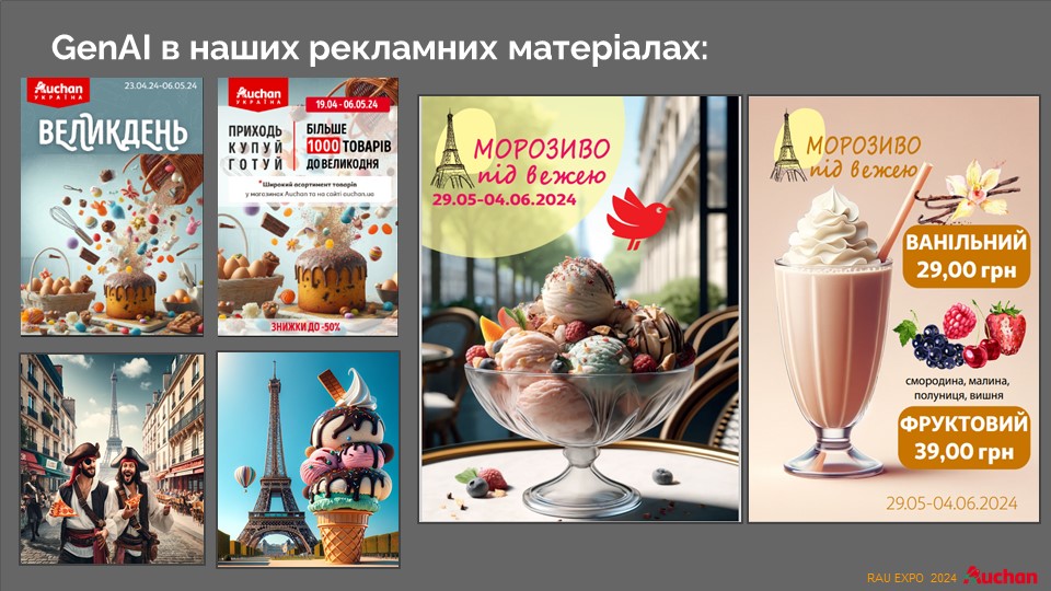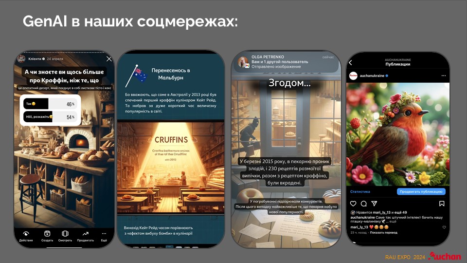 Специально для соцсетей, где люди предпочитают больше развлекаться во время войны, разрабатываются некоторые сюжеты событий. Например, к Пасхе ИИ рассказал целую историю о краффинах, визуализировав ее. Совершенно неожиданным оказался опыт визуализации птички малиновки – символа французской сети. Работники, развлекаясь, попросили ИИ создать образ украинской птички Auchan. Как оказалось впоследствии, эксперимент был удачным.