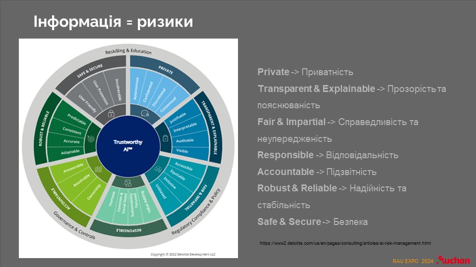 Несмотря на все преимущества, которые дает использование ИИ, следует помнить и о возможных рисках. Пока в Украине не существует законодательства по защите авторских прав на произведения, сделанные с помощью искусственного интеллекта. Однако оно обязательно со временем появится, и поэтому креативные агентства не останутся без работы. На этот случай компания Deloitte разработала целую стратегию работы с рисками, поскольку еще есть защита персональных данных. Потому что смартфон теперь знает, когда человек болел ковидом, покупал билеты и т.д. Потому эти риски тоже следует учитывать в момент внедрения ИИ в работу ритейлера.