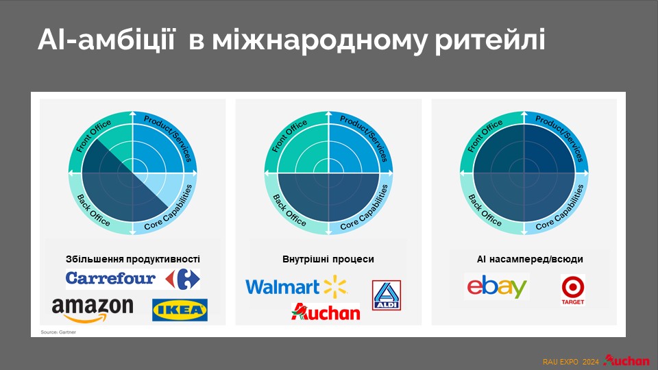 Международные игроки розничной торговли широко используют возможности искусственного интеллекта. А такие известные консалтинговые и исследовательские компании, как McKinsey и Gartner, даже написали специальные стратегии по использованию этой технологии. В настоящее время существует три стратегии применения ИИ в ритейле. Первая стратегия касается повышения производительности. Вторая – улучшение внутренних процессов в компании. Третья касается применения ИИ, где это возможно, и постоянное внедрение новаций по мере их появления. Ею, в частности, пользуются только в интернет-платформе eBay и американской сети магазинов Target. Их цель – показать свою суперинновационность.