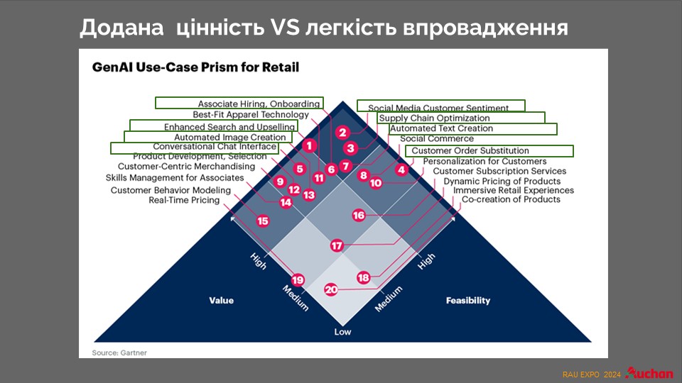 Как видим, наиболее легкими задачами являются оптимизация работы с настроениями клиентов в соцсетях, оптимизация цепочек поставок и создание текстов. А одними из самых тяжелых – ценообразование в реальном времени (RTP). Когда компании немедленно корректируют свои цены, как только обнаруживаются изменения на рынке, чтобы цены на продукты и услуги всегда были актуальны текущим рыночным условиям. Auchan только начинает работу в этом направлении, понимая значительный будущий эффект. Легче всего было реализовать набор персонала с помощью ИИ и создания различных текстов для отдела маркетинга.