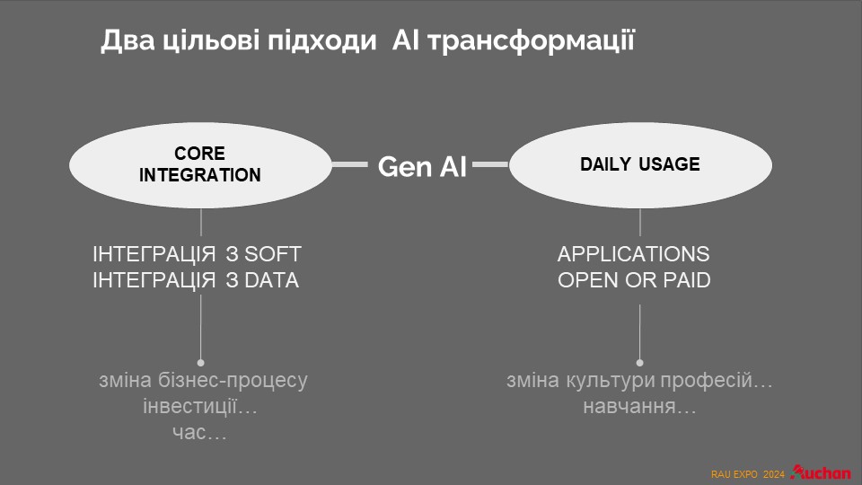 В Auchan Украина используют оба подхода, но главным все же остается ежедневное использование платных или бесплатных приложений. Потому что именно это ежедневное использование систем ИИ связано с изменением культуры профессий и обучением персонала.