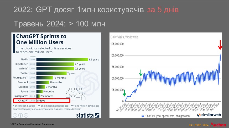 В частности, проведенный в мае 2024 года опрос персонала показал, что 50% сотрудников используют ИИ в жизни. Треть уже применяет генеративный искусственный интеллект на работе. То есть люди начинают понимать, что ИИ поможет сделать их более эффективными. О скорости изменений в сознании людей свидетельствует приведенный ниже график, где хорошо видно как росла популярность ChatGPT. В частности, он набрал первый миллион пользователей всего через пять дней. Также количество пользователей подскочило до 100 млн человек в течение мая 2024 года, когда новая версия стала доступной для всех.