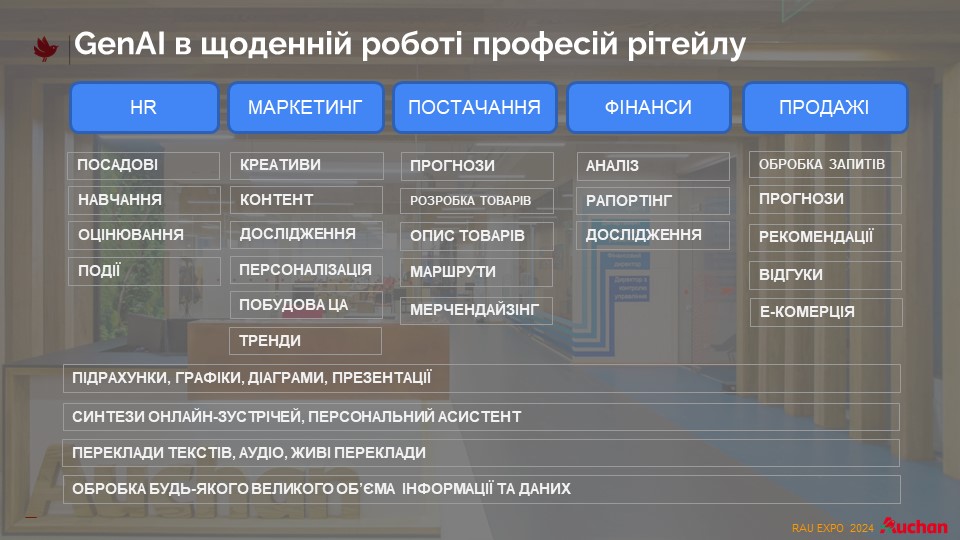 Возможности ежедневного применения генеративного ИИ в ритейле на примере сети Auchan приведены в таблице ниже по пяти основным функциям персонала.