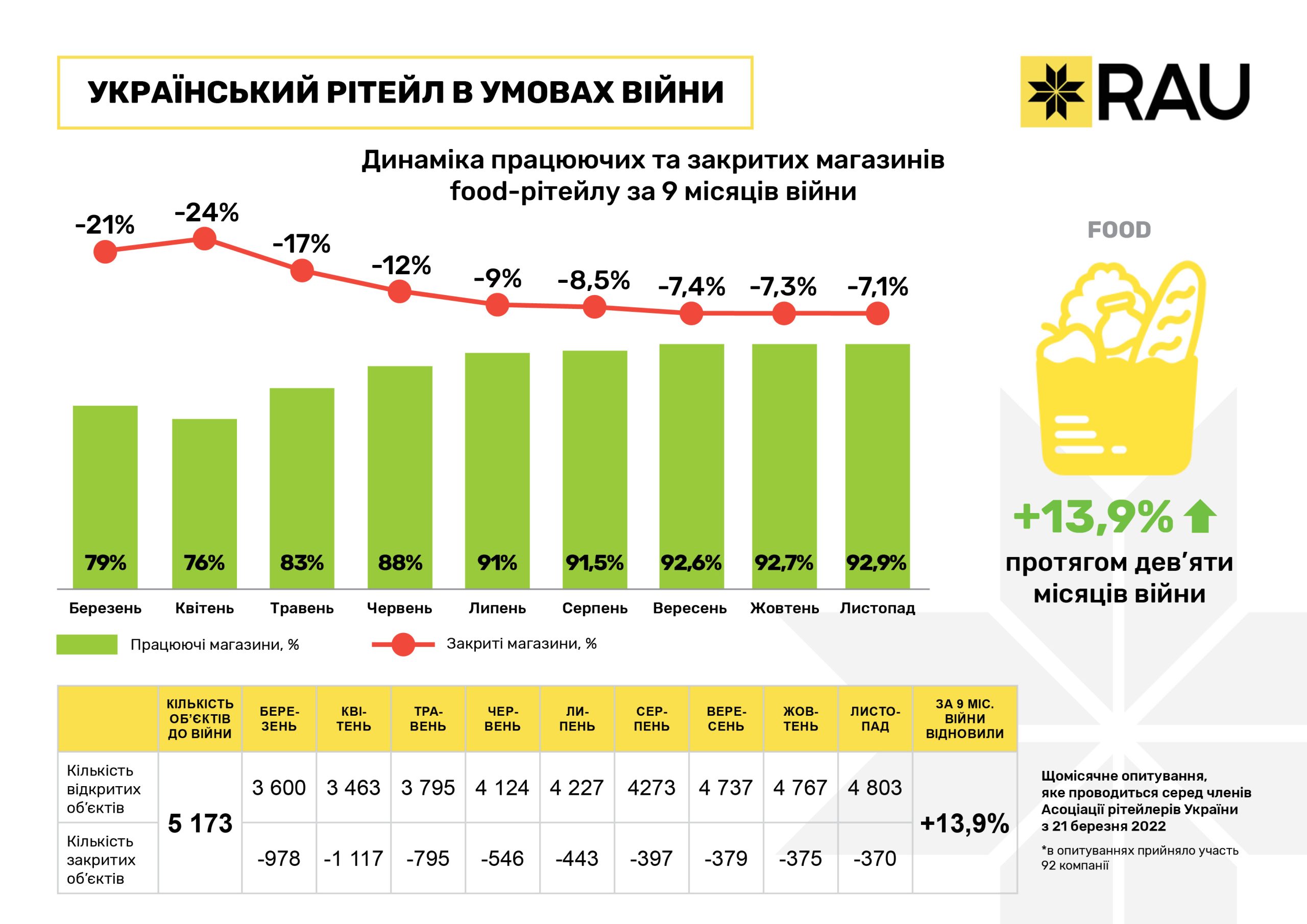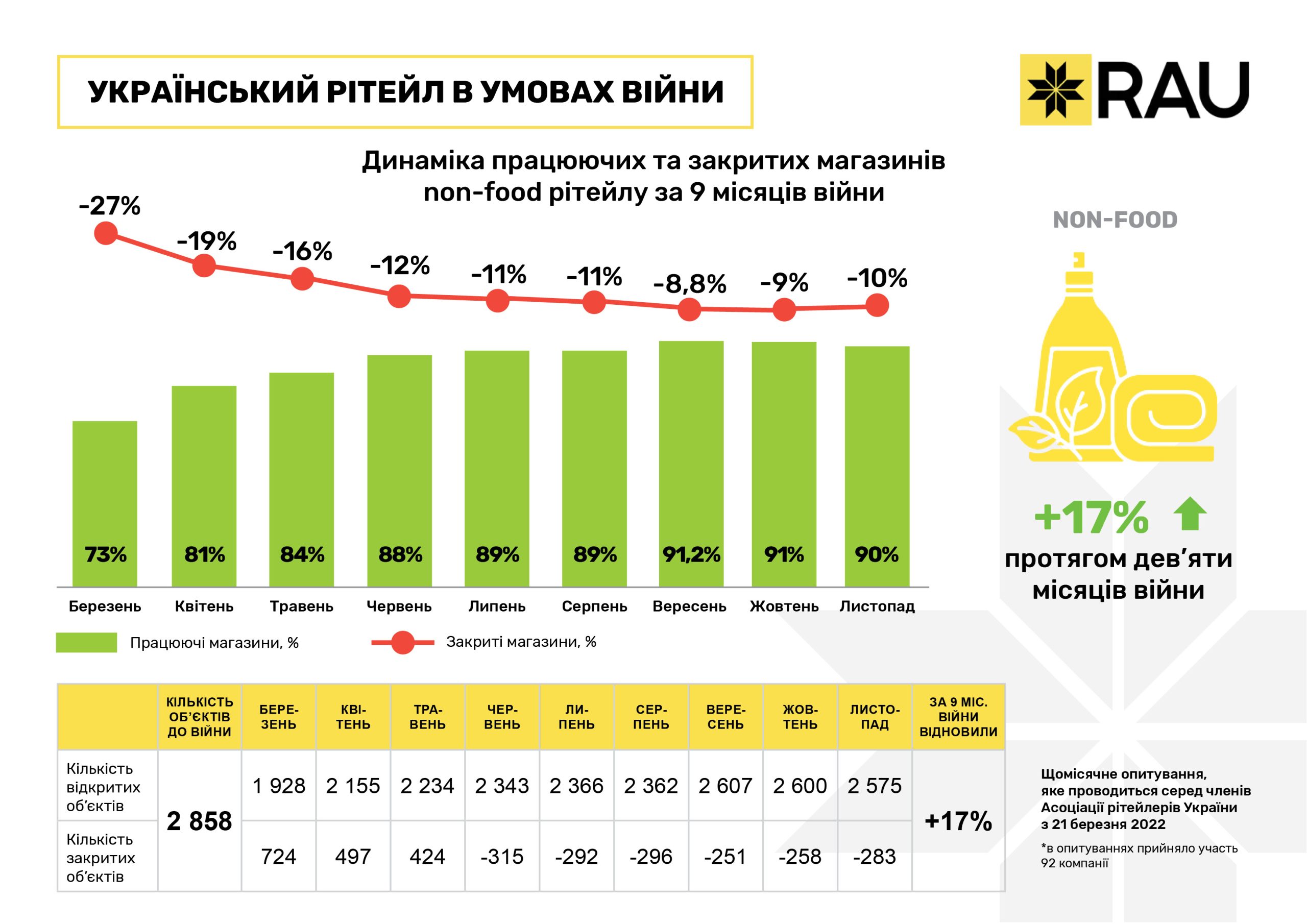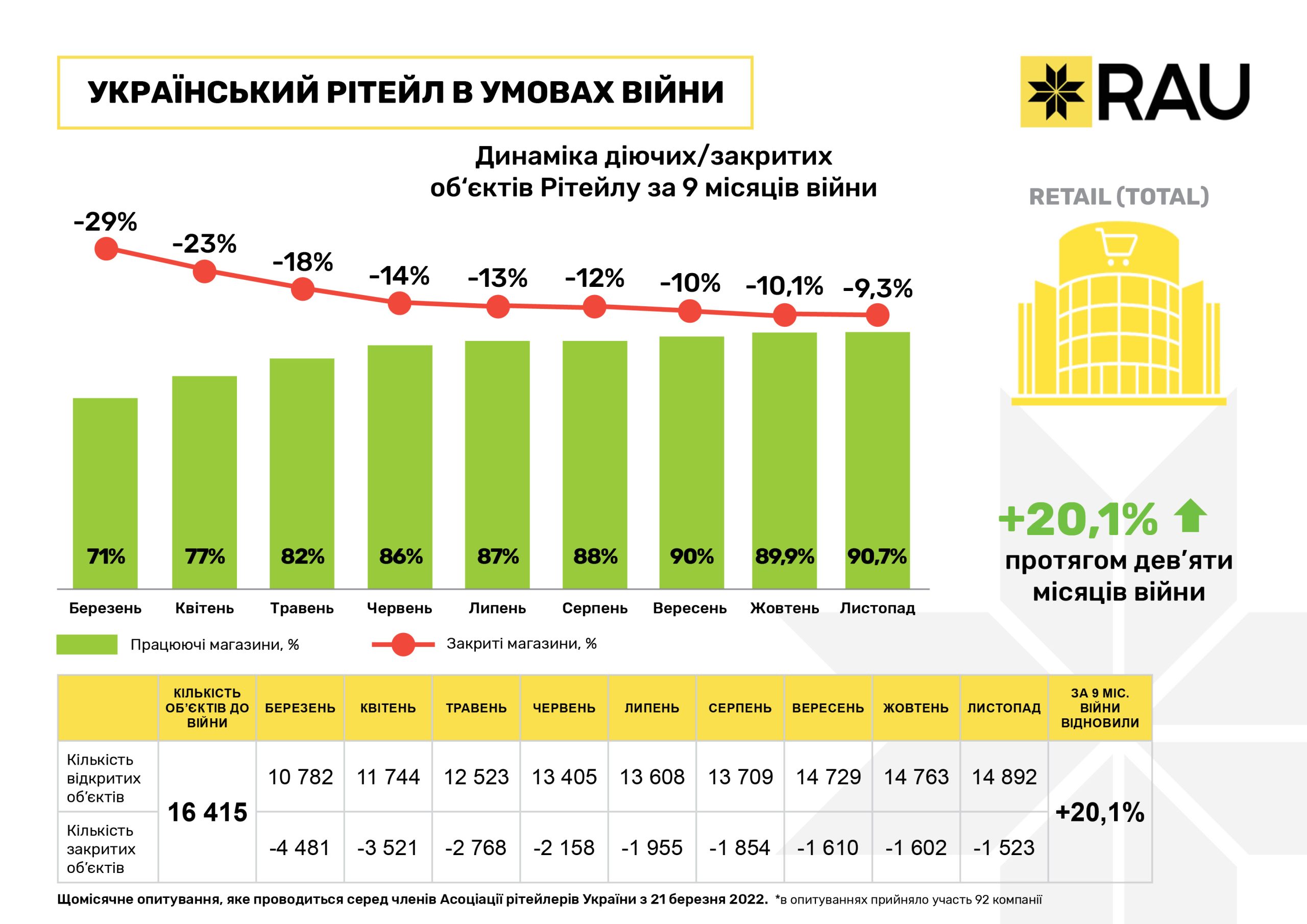 Очередное исследование, проведенное RAU методом онлайн-опроса примерно сотни владельцев и CEO предприятий по всей Украине, показало, что на 20 ноября 2022 года было закрыто по тем или иным причинам уже менее 10% торговых объектов/магазинов. За три последних месяца этот показатель снизился почти на 3%.
