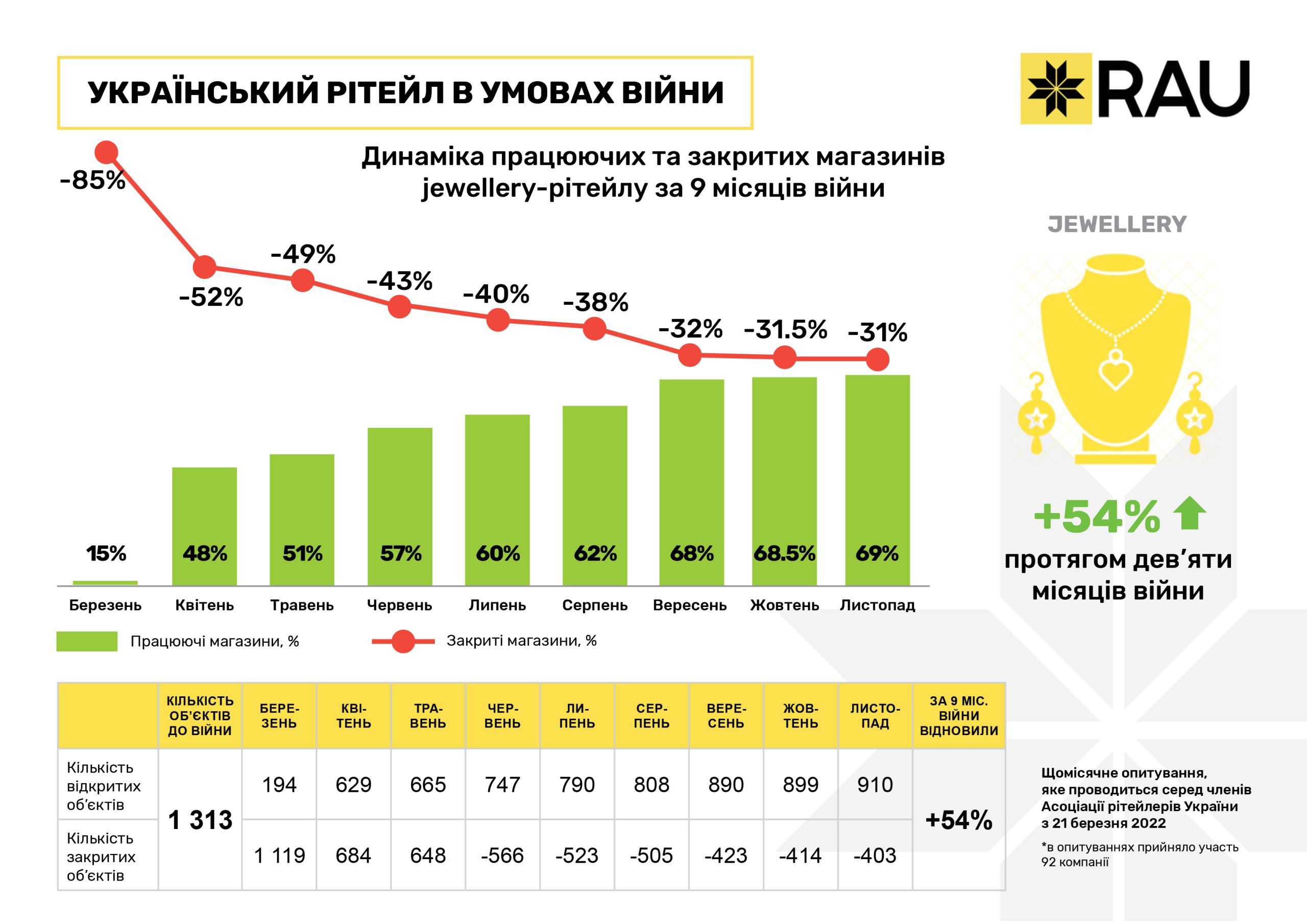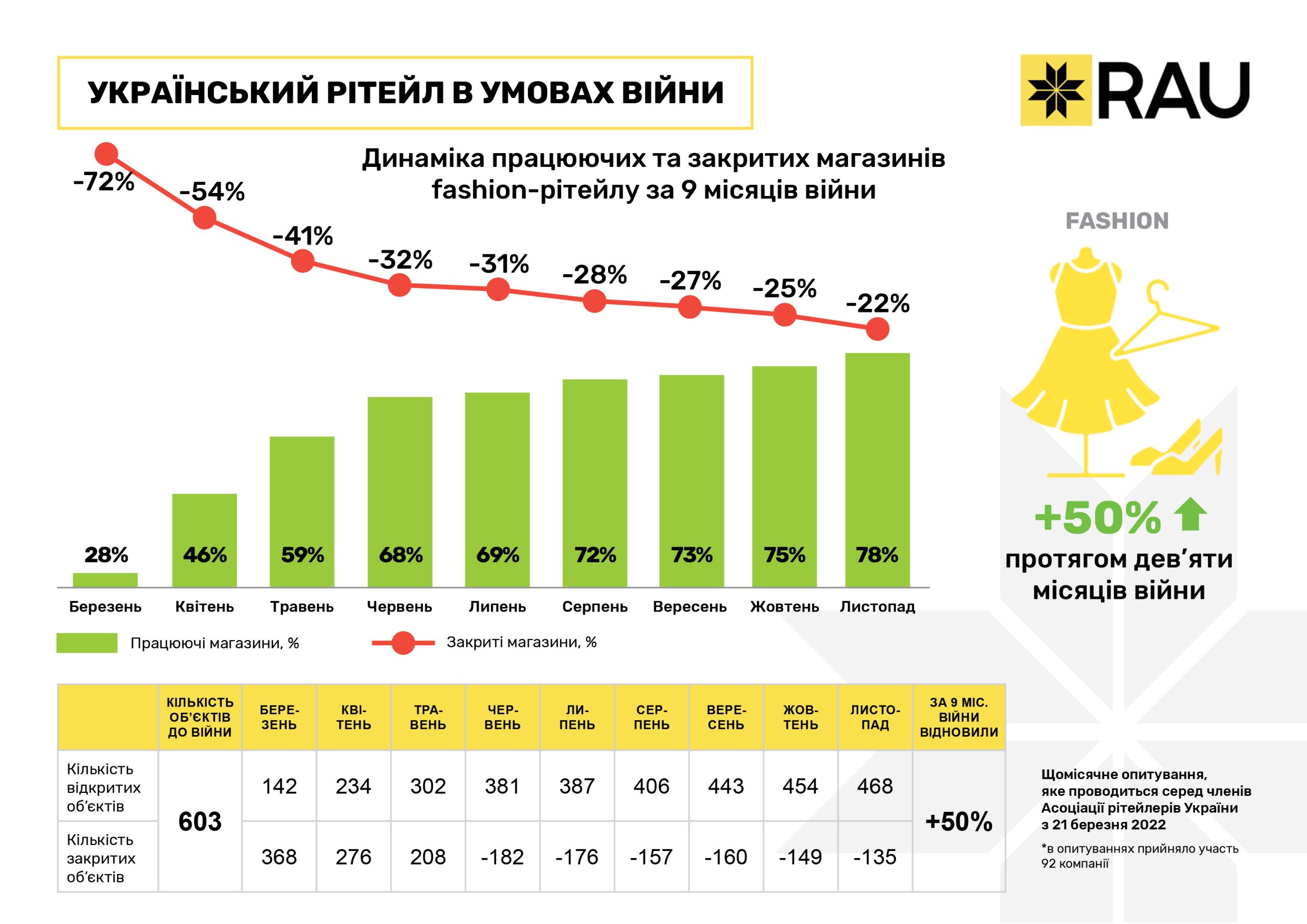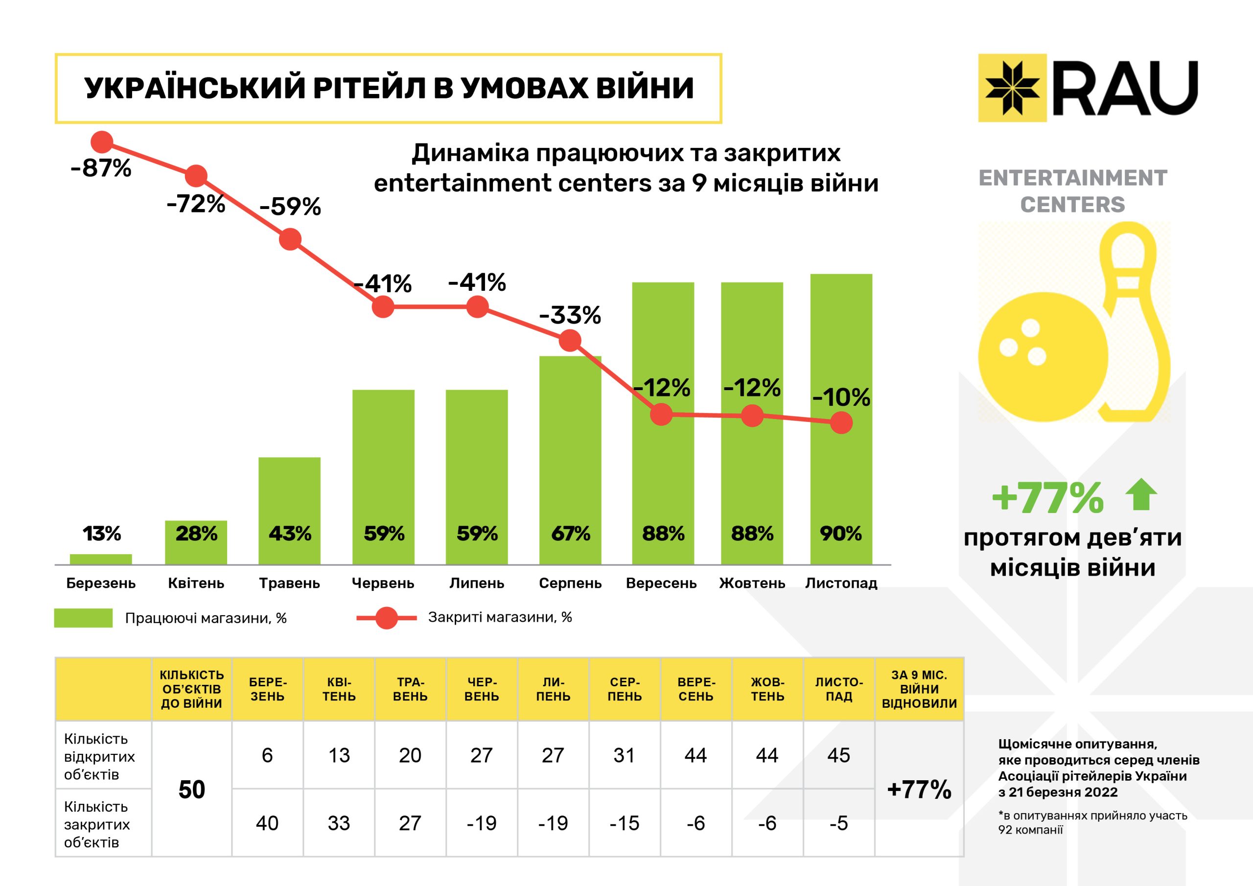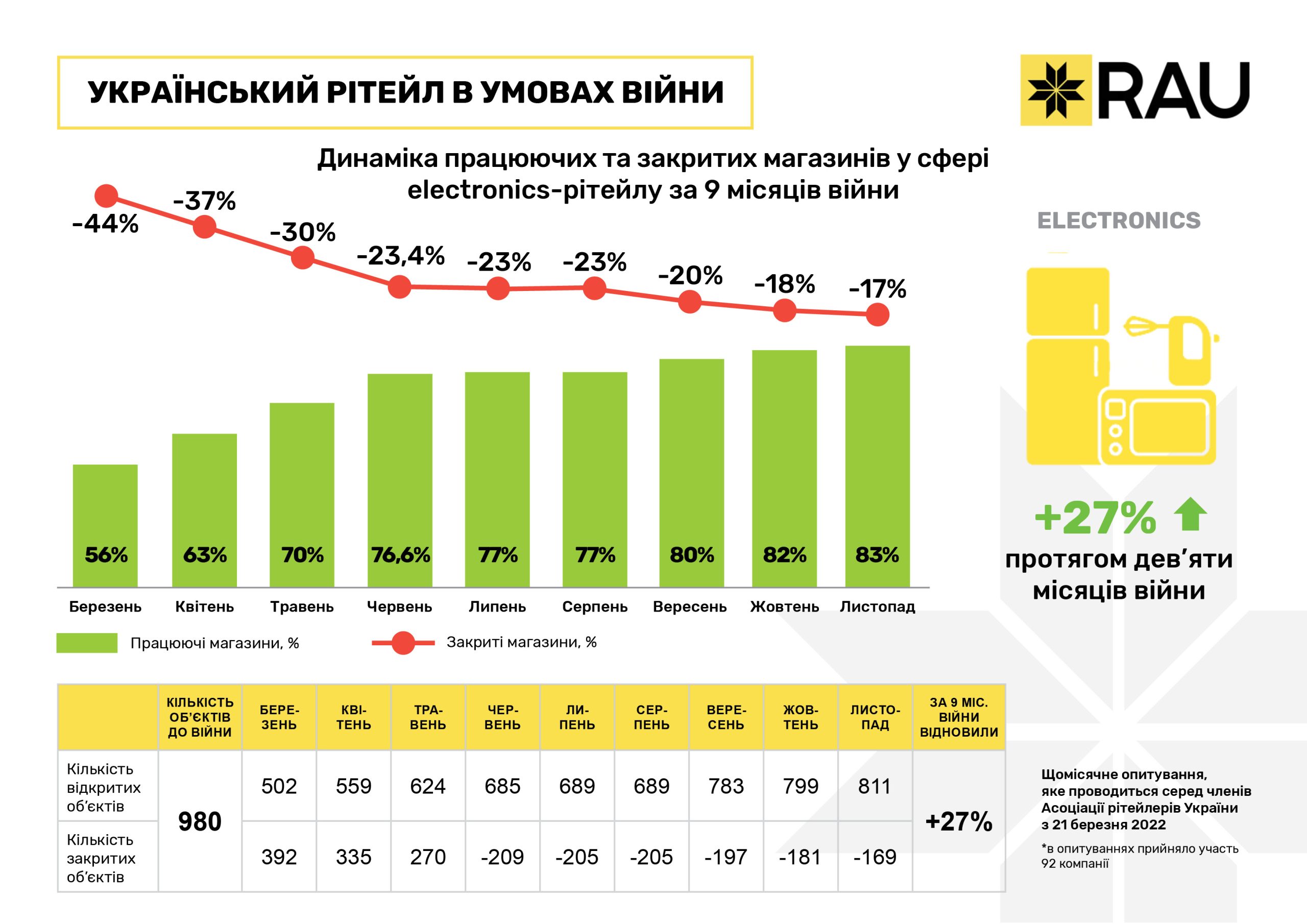 Очередное исследование, проведенное RAU методом онлайн-опроса примерно сотни владельцев и CEO предприятий по всей Украине, показало, что на 20 ноября 2022 года было закрыто по тем или иным причинам уже менее 10% торговых объектов/магазинов. За три последних месяца этот показатель снизился почти на 3%.