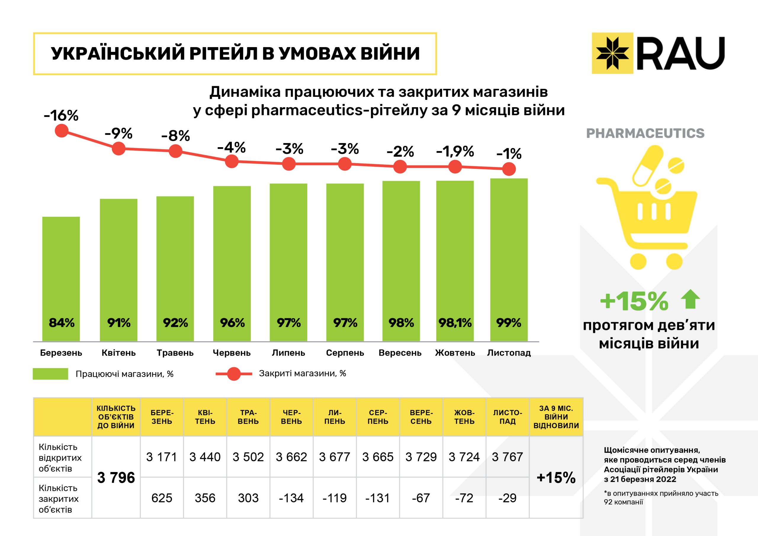 Фактически возобновили работу сетей почти до довоенного уровня продавцы лекарств и медицинских изделий. Доля работающих точек сетей достигла отметки в 98,2% уже в сентябре, а в ноябре работало уже 3767 аптечных заведений или 99% от 3796 точек, открытых до начала полномасштабной войны. Таким образом, доля неработающих аптек уменьшилась с 16% в марте до 1% в ноябре или на 15%. В настоящее время остаются закрытыми 29 аптек. Следует отметить, что в октябре количество неработающих заведений несколько увеличилось (с 67 до 72), однако уже в ноябре более половины из них приступили к работе.