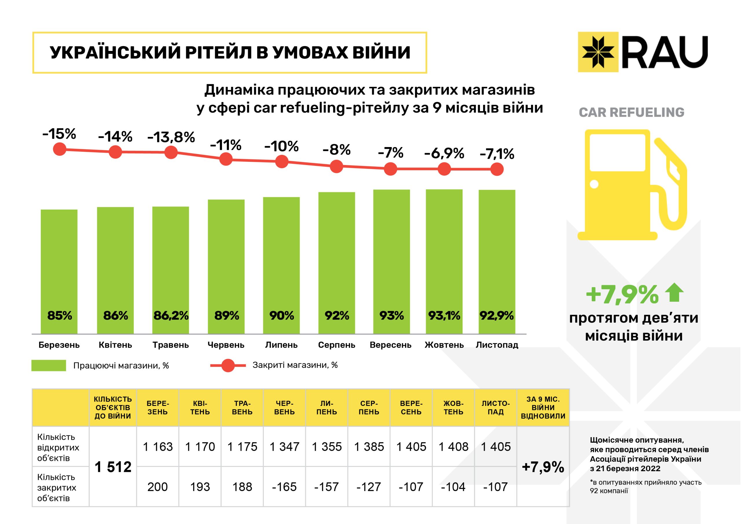Торговля топливом, равно как и лекарствами, востребована в любое время, поэтому закрытие около 200 заправок (или 15%) из 1512, работавших до войны, было связано прежде всего с разрушениями или оккупацией врагом. Соответственно по мере освобождения территорий и возобновления функционирования уцелевших АЗК процент работающих заправок постепенно наращивался. В ноябре уже работало 1405 точек или 92,9% от довоенного количества. То есть, за девять месяцев доля работающих объектов сетей АЗК выросла на 7,9%. В частности, осенью количество закрытых заправок уменьшилось на 20 штук.
